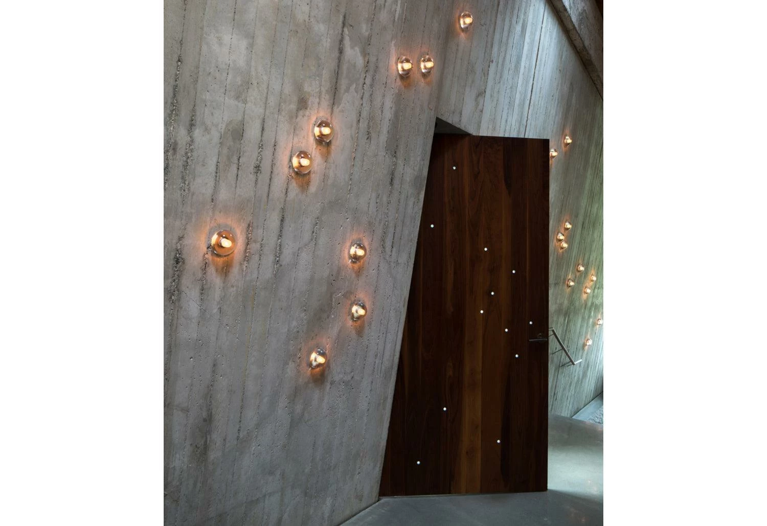 An articulated cast glass hemisphere with a frosted cylindrical void that houses a low voltage or LED lamp. The 14 series sconces are visually quite subtle. The light interacts with the imperfections, rifts, bruises and bubbles of the cast glass to make a rich halo of light.