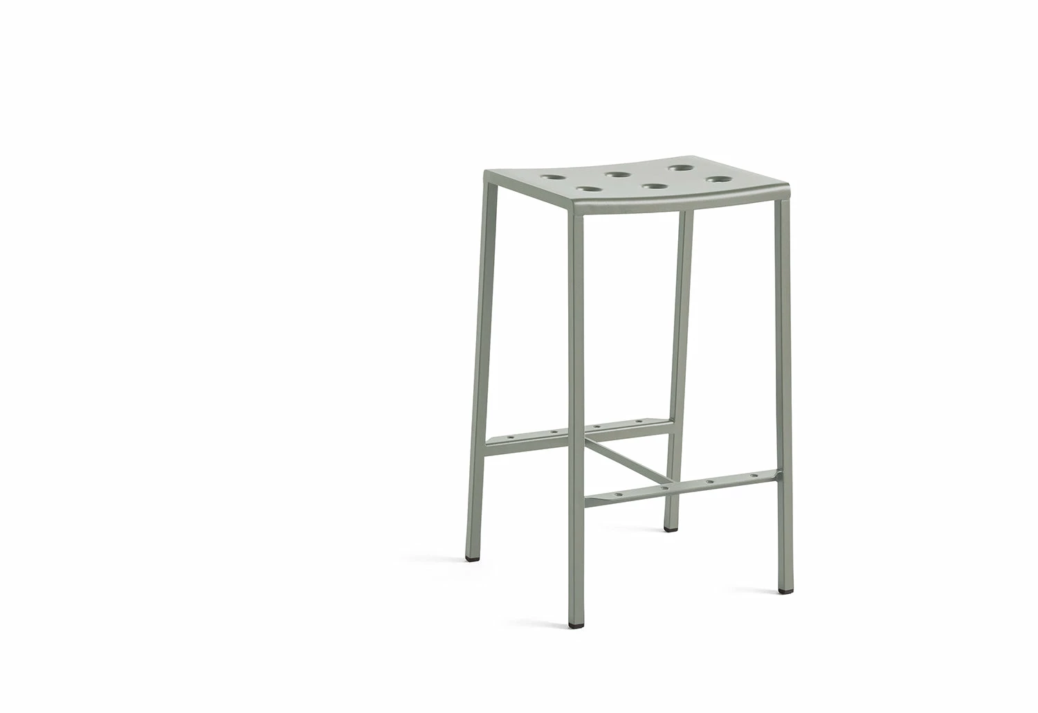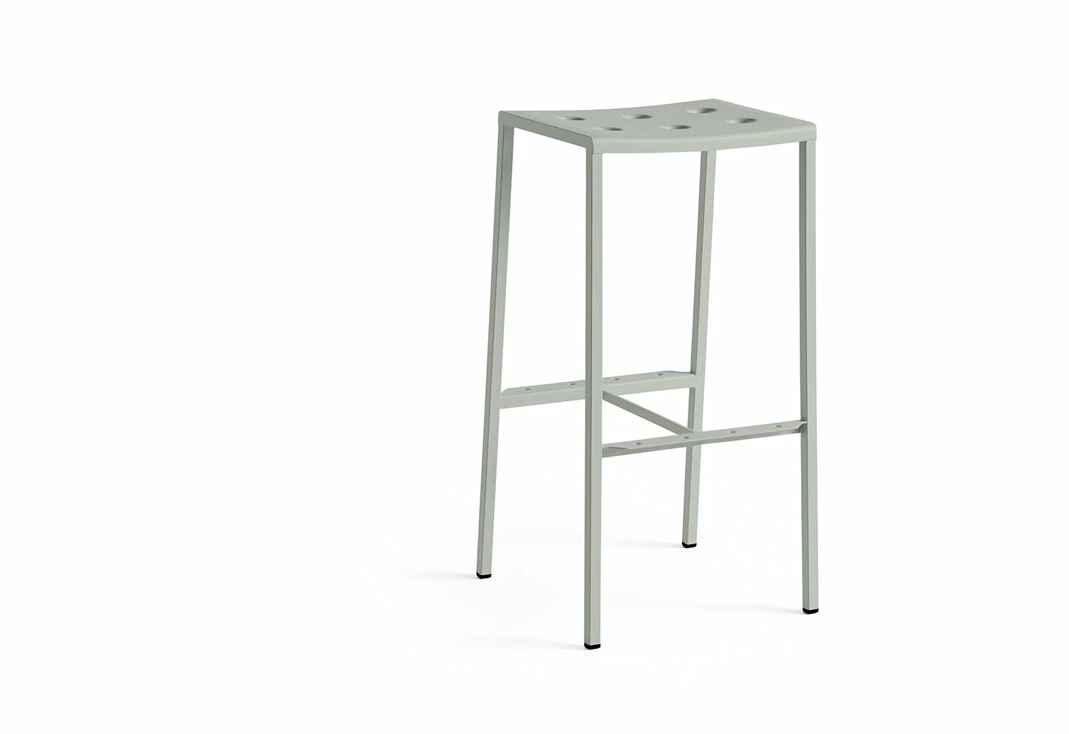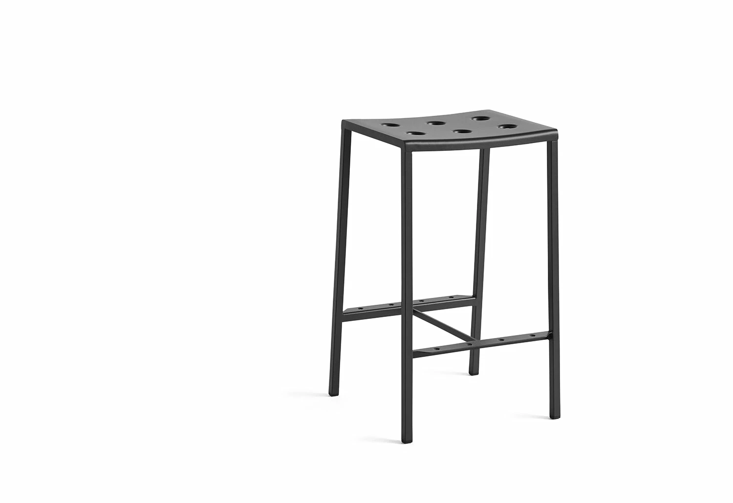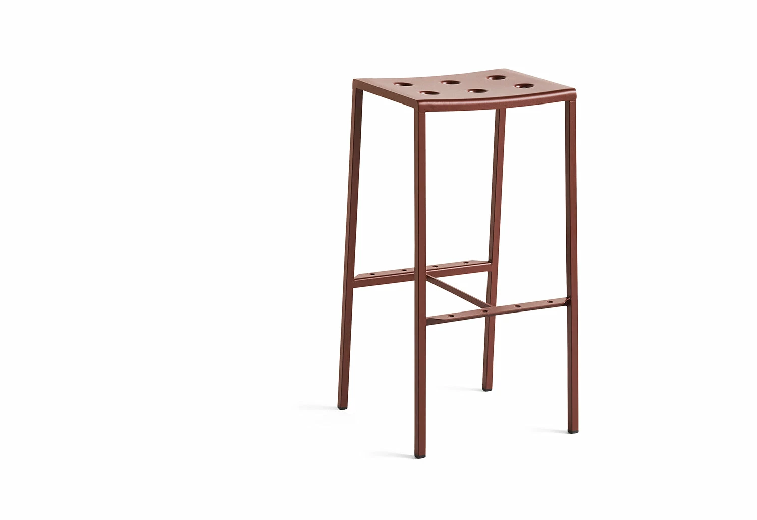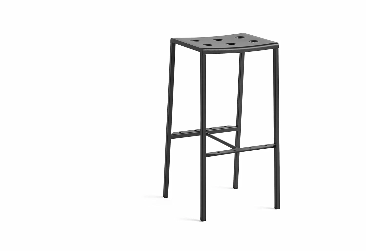 Introducing the Balcony Bar Stool, a stunning and practical outdoor seating solution designed by Ronan and Erwan Bouroullec for HAY. With its sleek rectangular shape, comfortable bowl-formed seat and thin legs, this stool is perfect for adding a touch of elegance to any outdoor space. The unique multiple holes in the seat not only create a striking visual appeal but also add strength to the stool’s construction.
