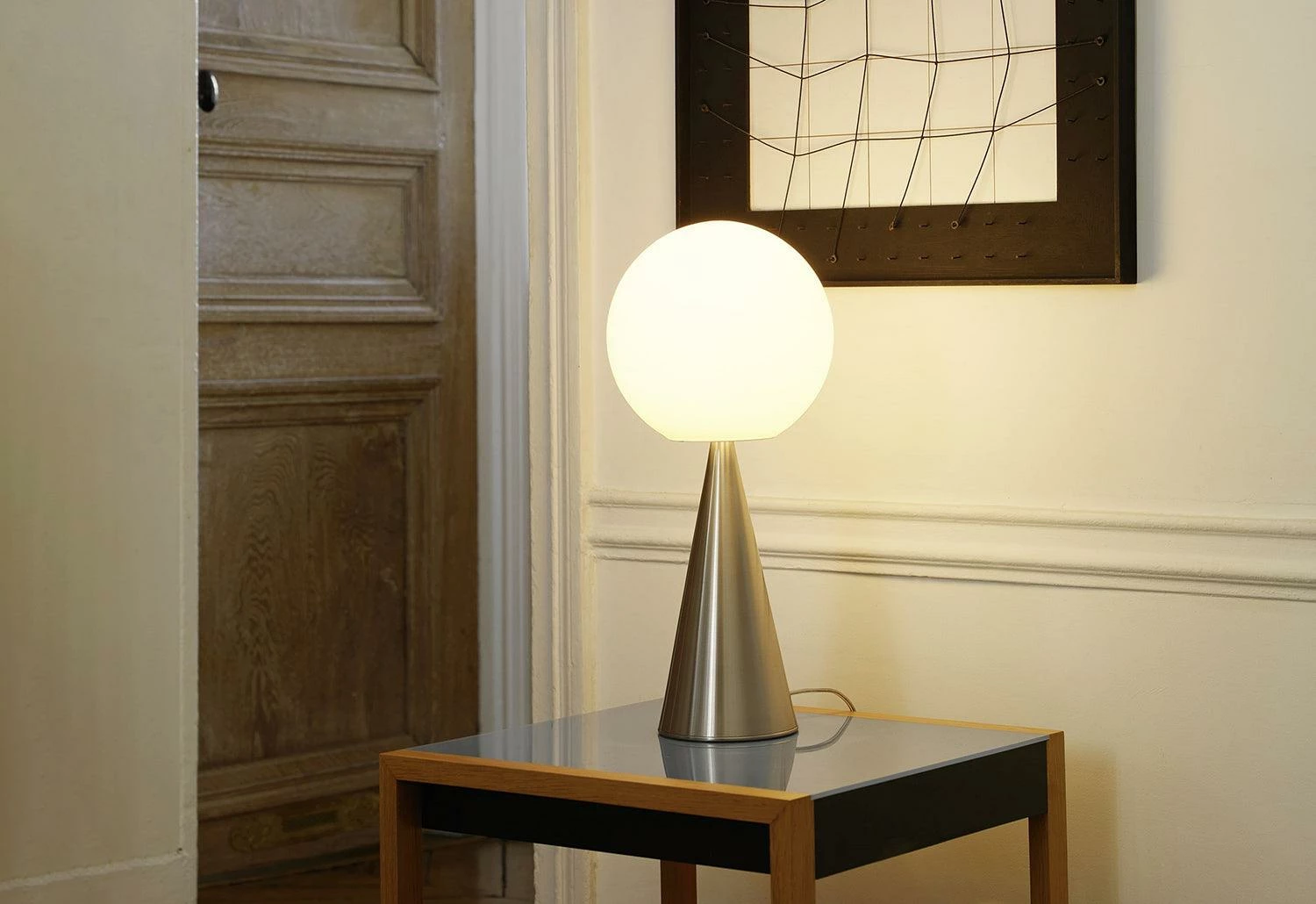A geometric formed table light, with a cone base and spherical bulb. The composition is perfectly proportioned and has extraordinary balance. A stylish lamp made using non-reflective materials.