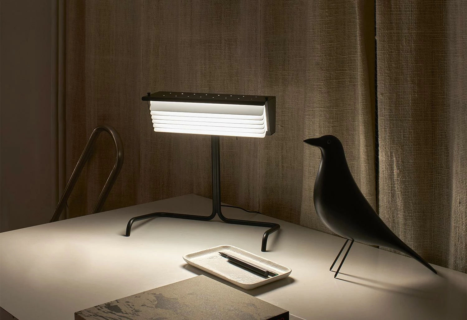 A steel base powder coated in black or white provides stability. The On/Off switch is on the underside of the body, making it suitable for use on a desk or bureau.
