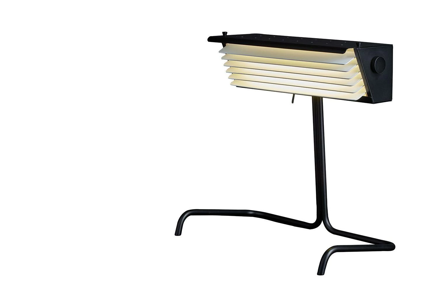 Designed in 1958, the modernist Biny range has a distinctively industrial aesthetic. The aluminium body features movable fins that can be used to direct light up or down according to the intensity needed. A wheel on the body allows control over the angle of the fins through an arc of 50°.