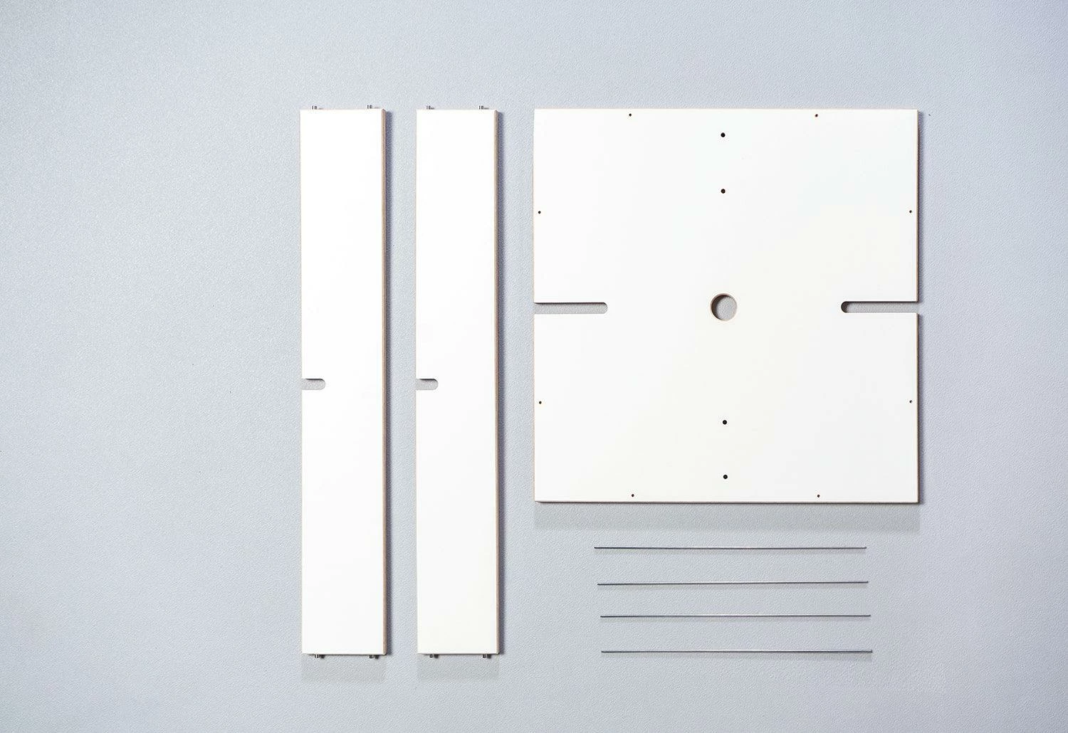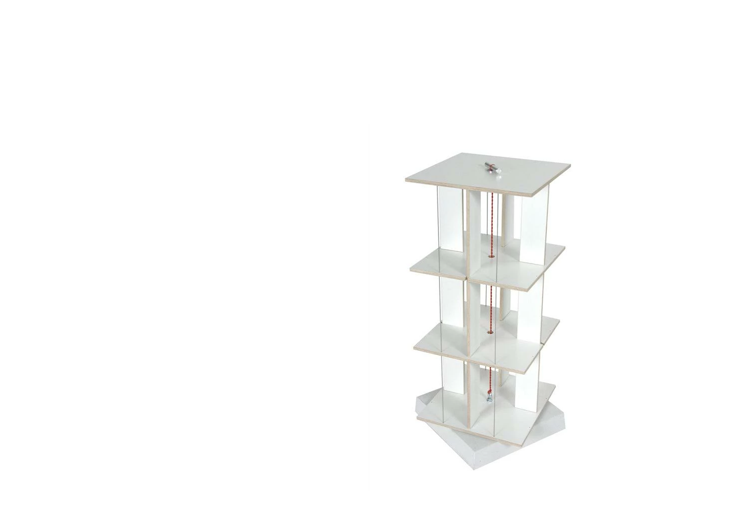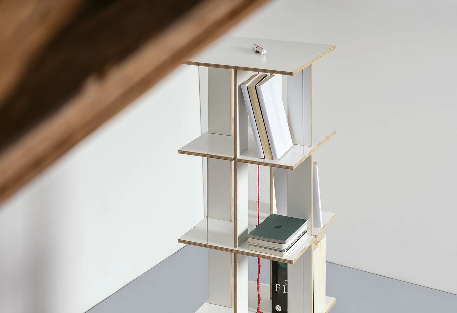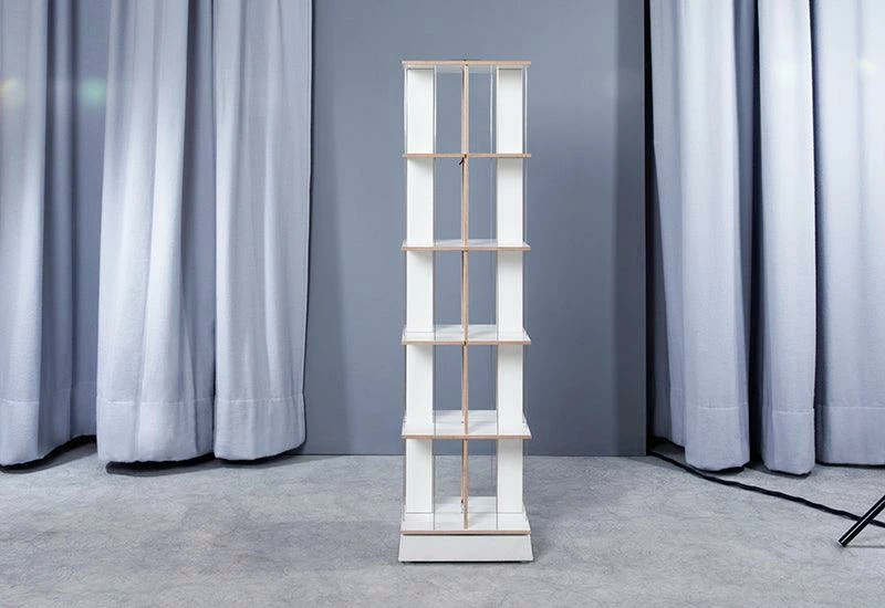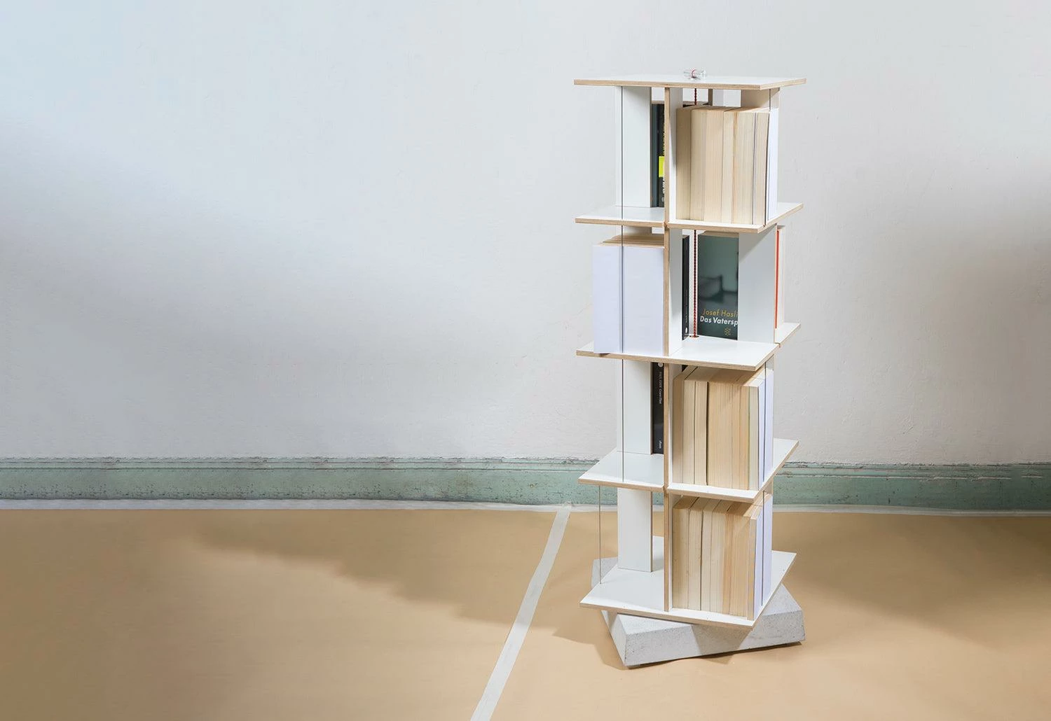 It is possible to assemble the Buchstabler bookcase at coffee-table height (two levels) and up to Buchstabler seven levels to make a tall tower of 174cm. The Buchstabler shelving unit is held together with a simple, but clever technique: a string connects the base and the top of the shelf. The tension, produced from twisting the string, holds the unit tightly together. It becomes nearly invisible when completely filled with books. A base made of cast concrete makes the birch plywood shelving unit stable.