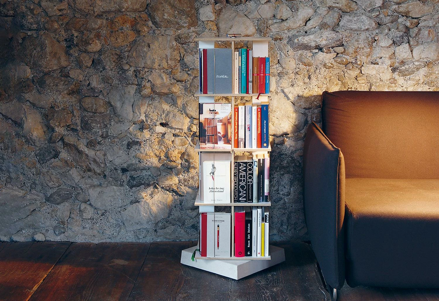 The Buchstabler rotating shelving unit for paperback books. A maximum number of books can be stored in a space-saving and organised way (approx. 25 pocket books per level). The bookcase is simply held together without screws or traditional fixings. It is freestanding and if required can be extended to add more height.