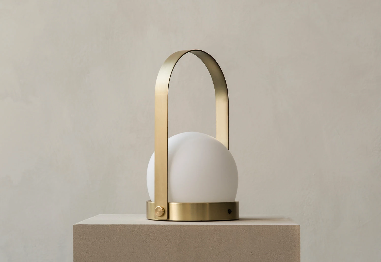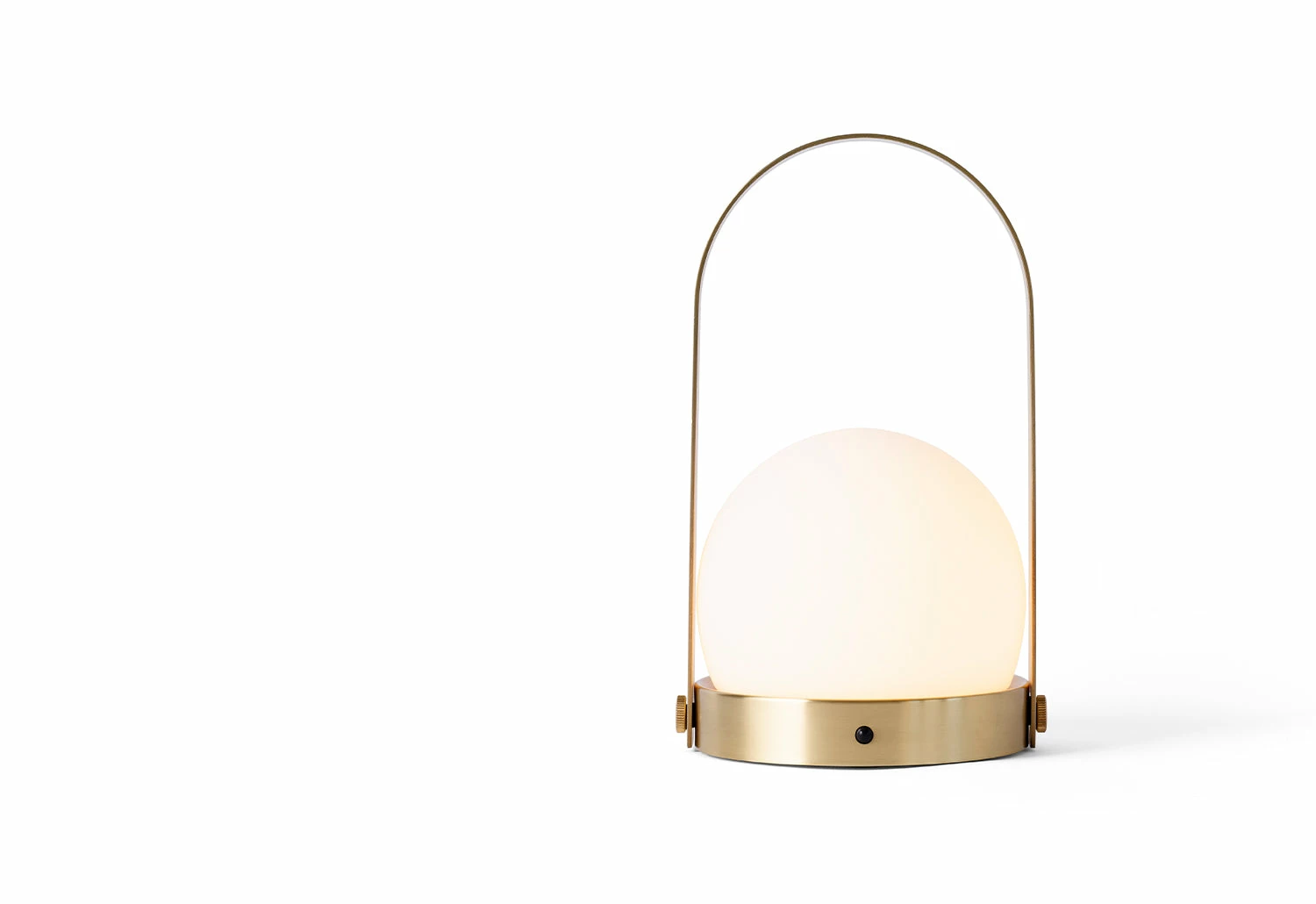 Its minimalist form is easy to use, with a small button to illuminate and dim, and a brushed steel or brass handle to carry it. Featuring a brushed brass body and an opal shade, the versatile lamp can be used as outdoor lighting, as a desk lamp or anywhere at home to softly illuminate any dark spaces.