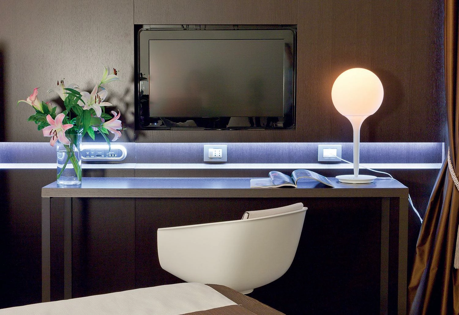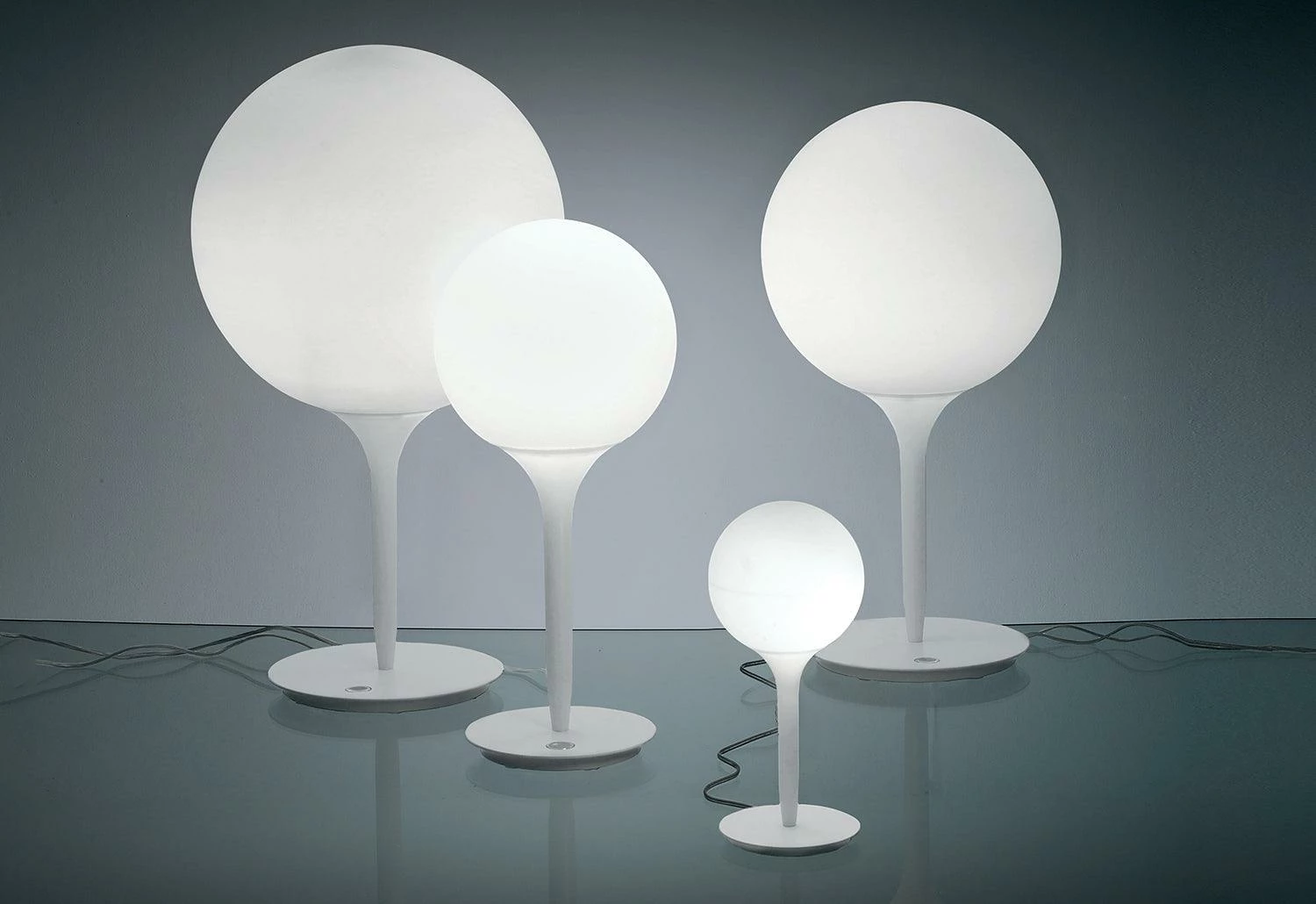 Table-standing luminaire for diffused incandescent lighting, available in four sizes. Diffuser in white handblown glass, with external etched finish.