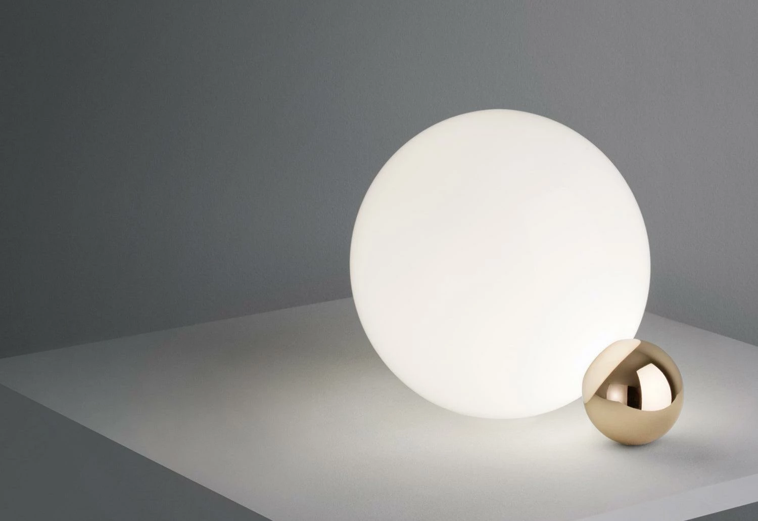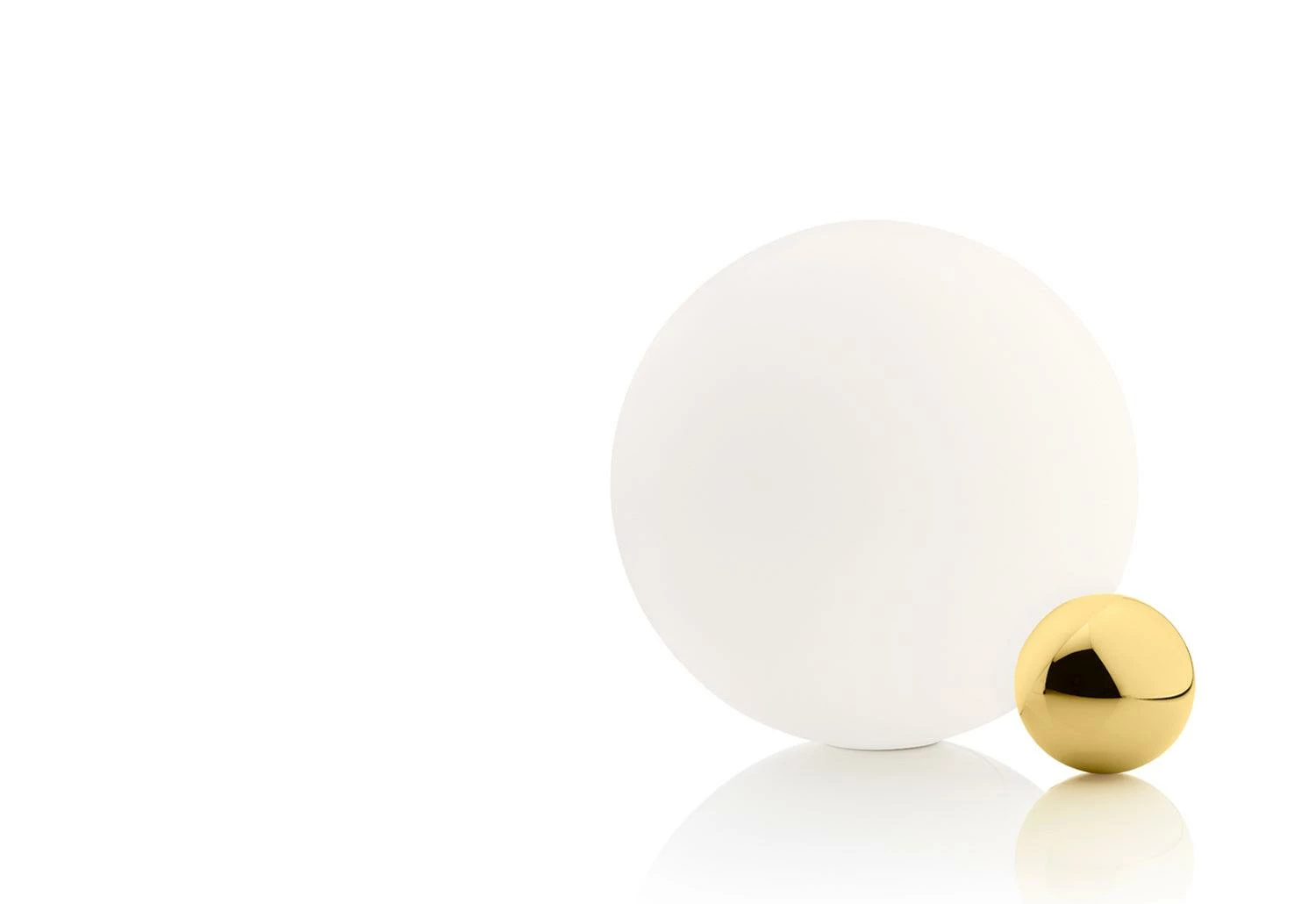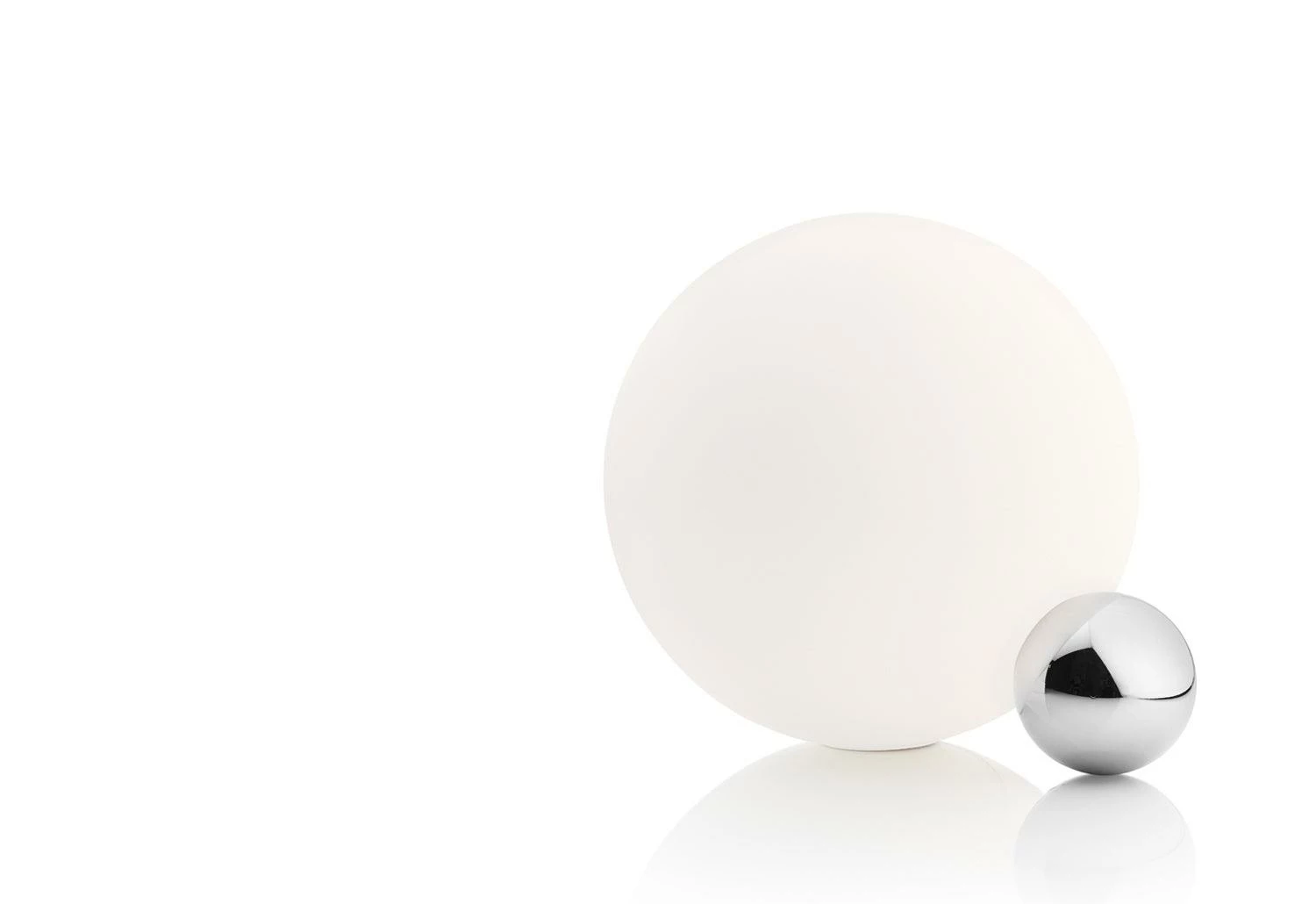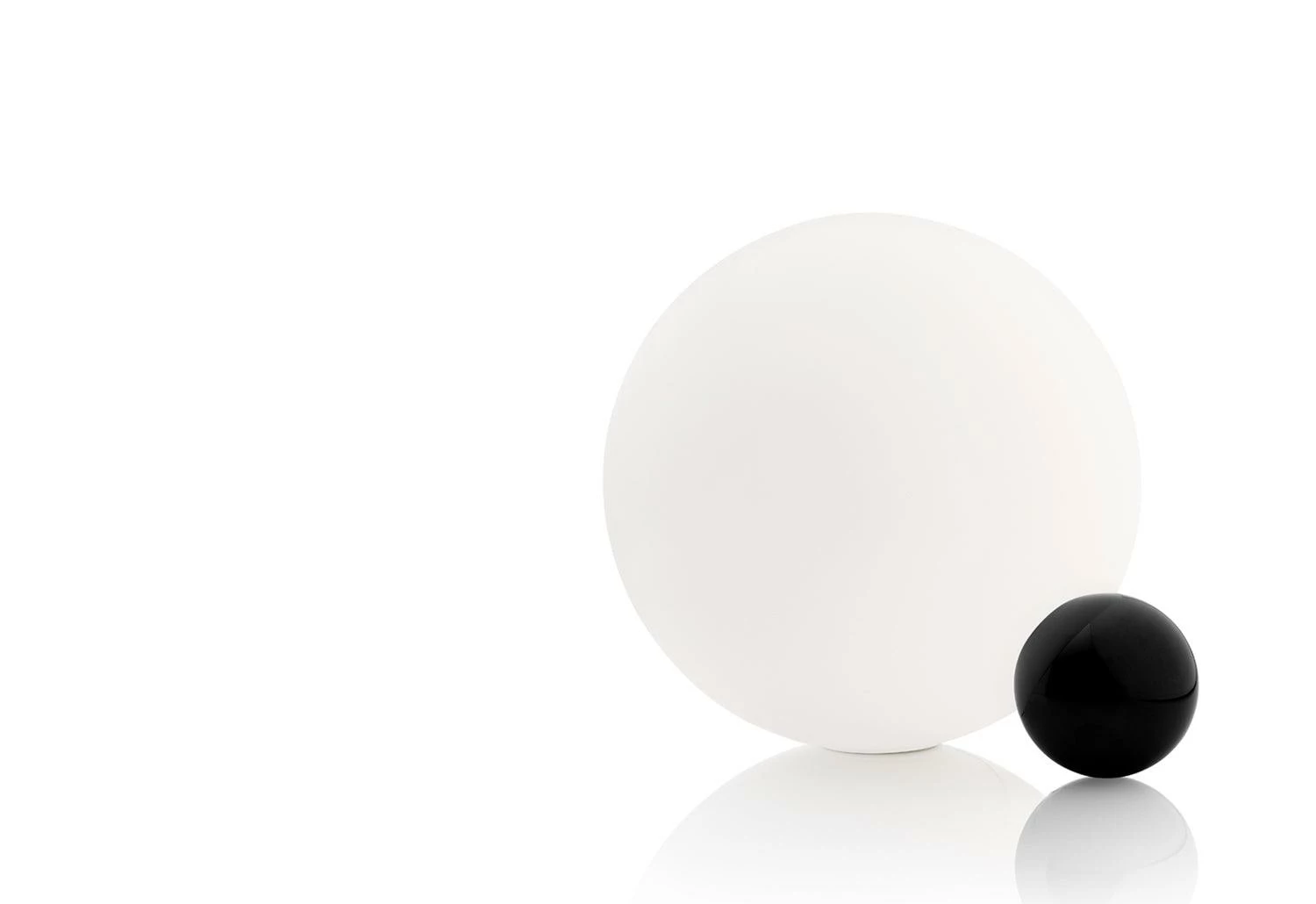 The smaller sphere is available in several finishes and conceals an LED source that directs a beam of light into the larger sphere made of blown glass, thus generating a smooth and uniform light.