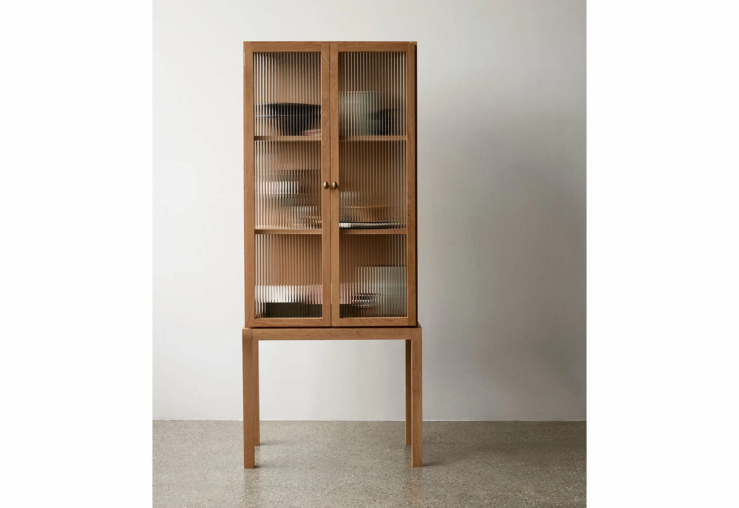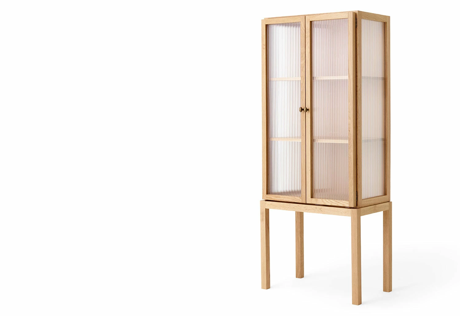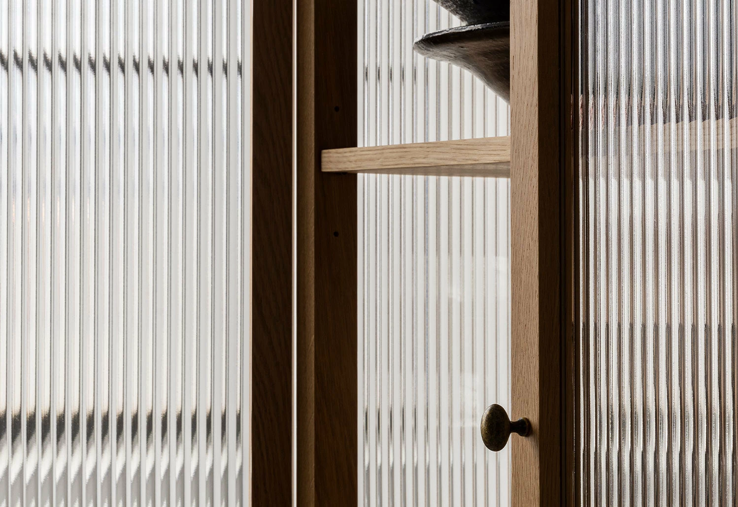 Featuring two semi-transparent, glass-reeded doors at its front, the cabinet softly obscures its contents, ensuring a tidy appearance without completely hiding what is within. When opened, the cabinet reveals bronzed brass fittings and two oak veneer shelves that can be adjusted to various heights.