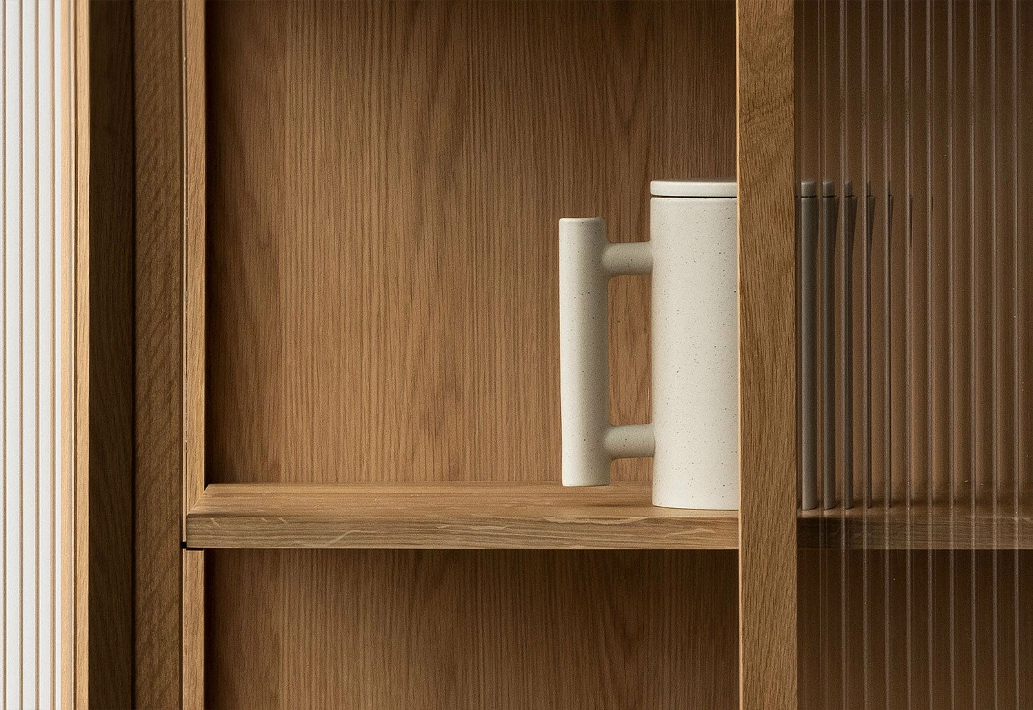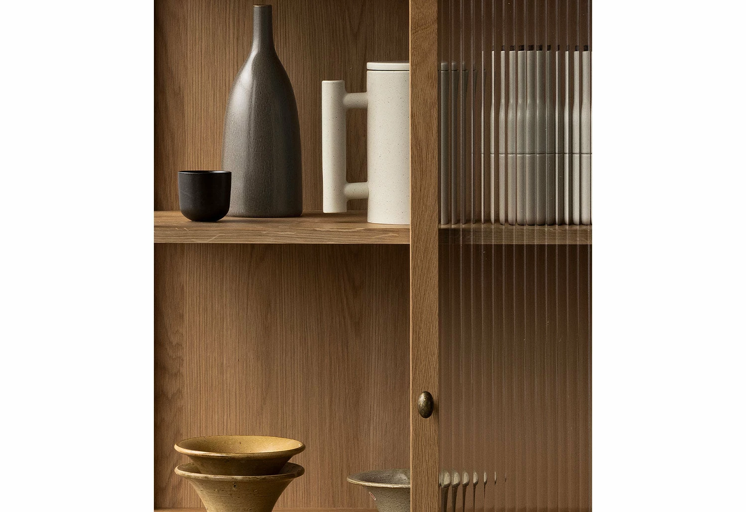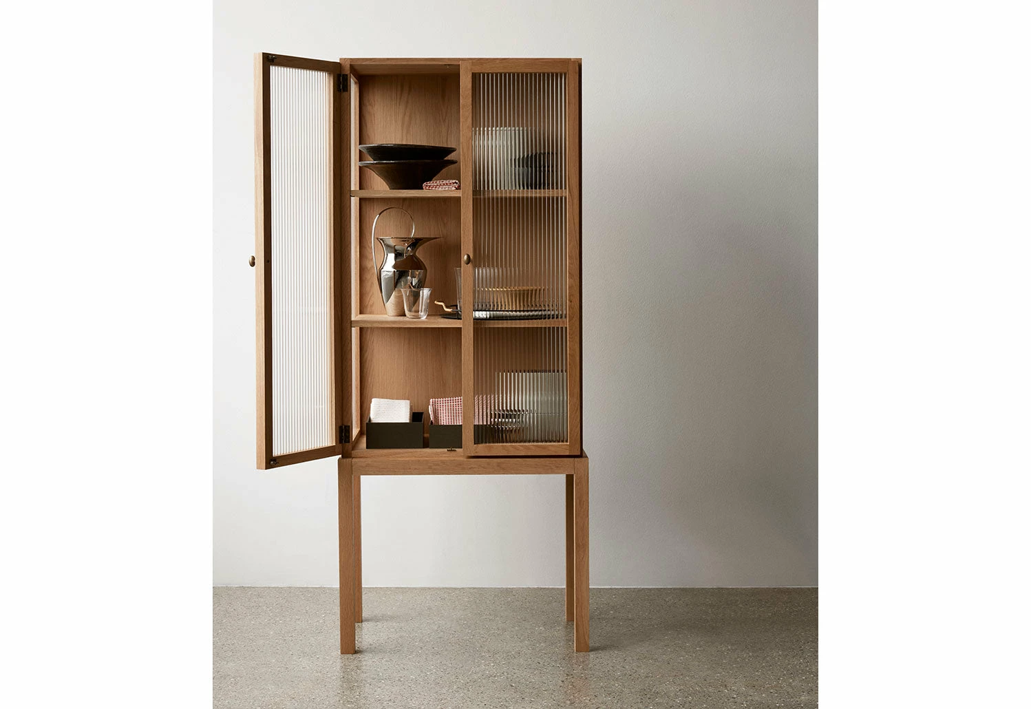 Featuring two semi-transparent, glass-reeded doors at its front, the cabinet softly obscures its contents, ensuring a tidy appearance without completely hiding what is within. When opened, the cabinet reveals bronzed brass fittings and two oak veneer shelves that can be adjusted to various heights.