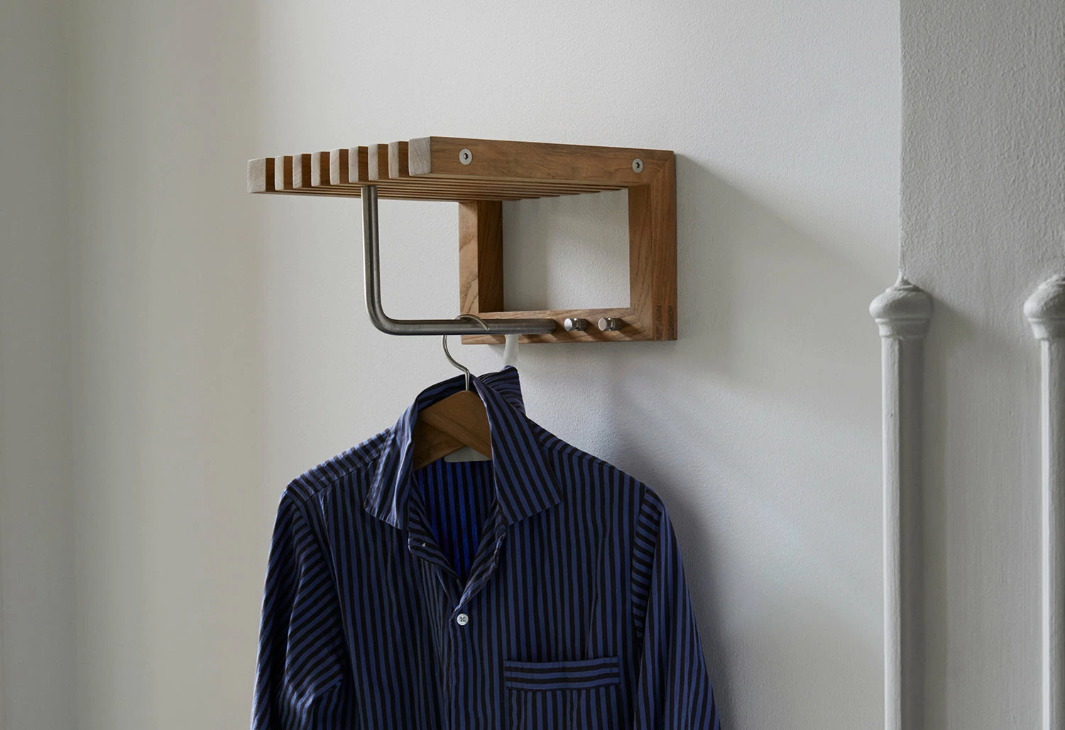 The Cutter mini-wardrobe incorporates a hanger rail, four hooks and a hat shelf. A practical little Cutter Box for gloves and caps can be placed on the shelf (see ‘More products in the range’ below for Cutter box).Â