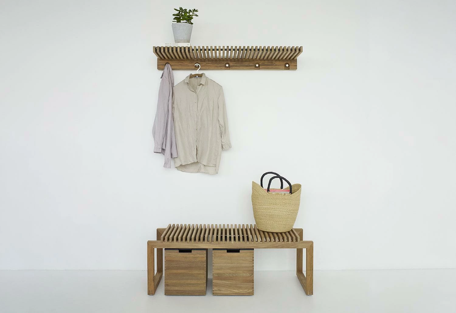 The Cutter collection includes a bench, wheeled storage boxes and wall mounted shelf with hooks and hangers that can be grouped or bought individually. Designed by Niels Hvass, the detailing within the family exposes their precise construction.
