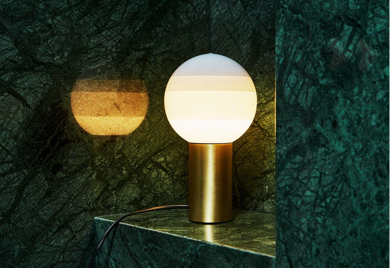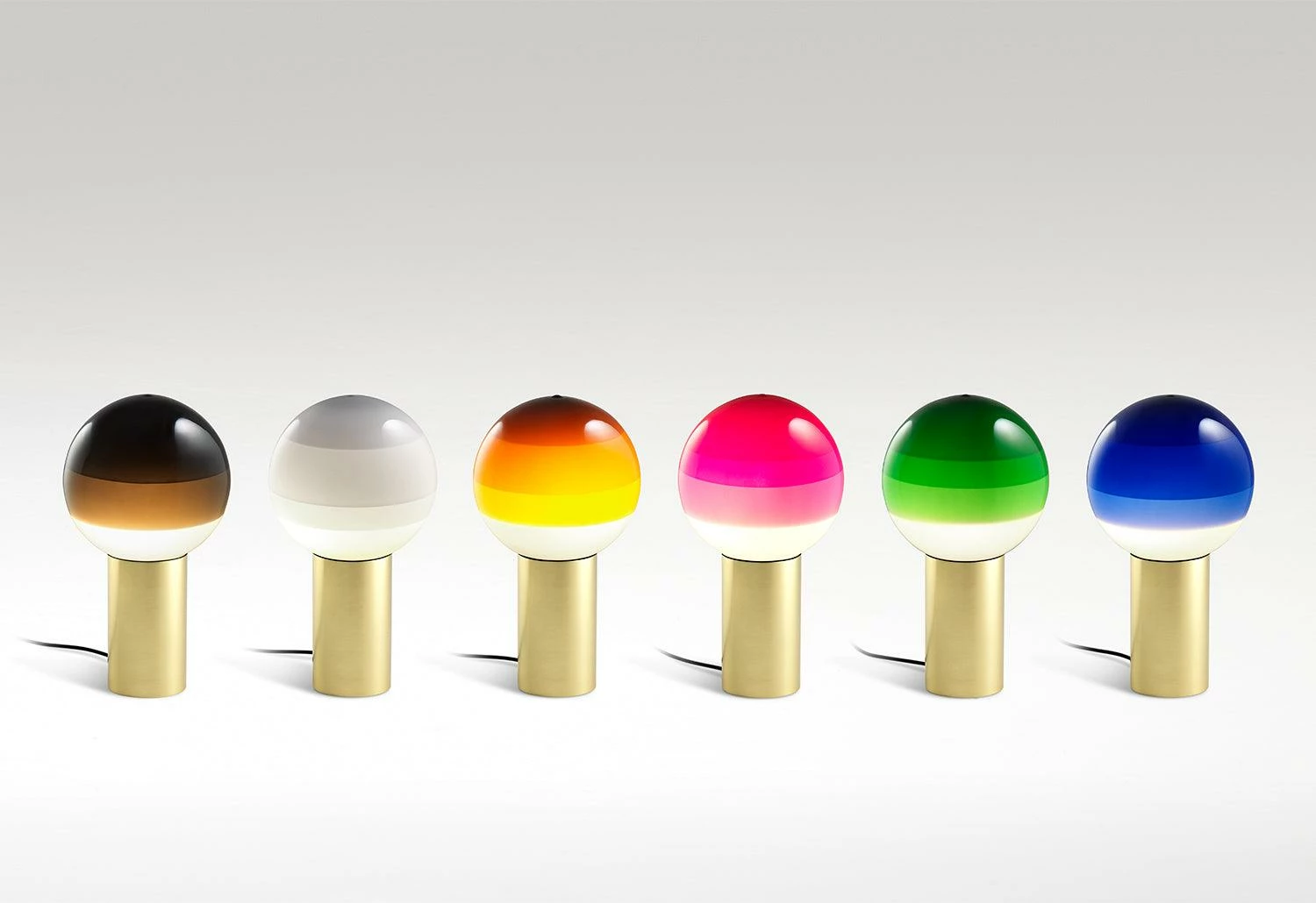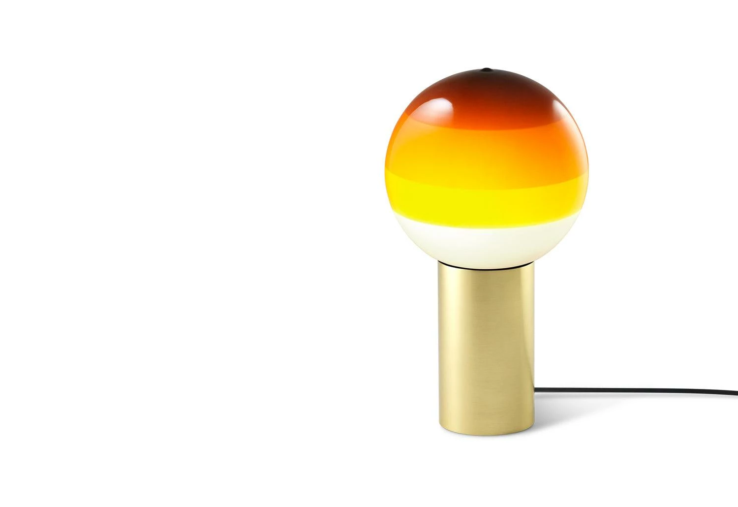 The lamp features a brilliant white blown-glass globe, hand-dipped in paint several times to create concentric rings of colour. The layering of paint moderates the light intensity when illuminated, performing as a shade and creating a range of ambient light to suit any décor.
