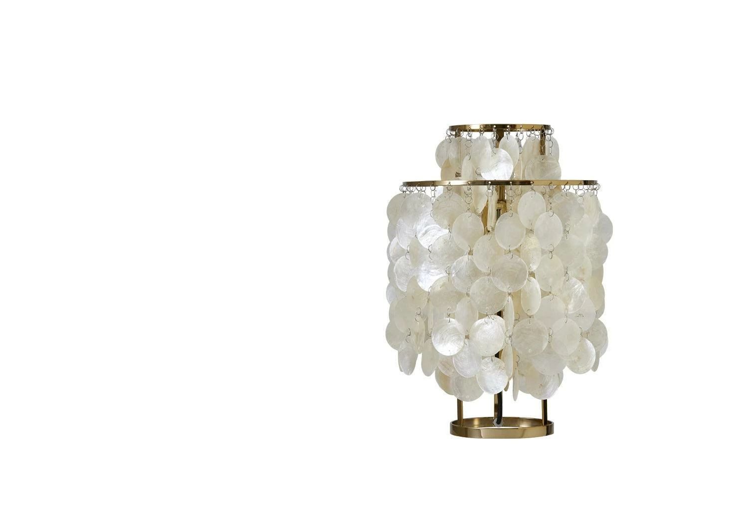 A decorative table lamp with a cluster of the mother of pearl seashell discs attached to metal rings. Panton was often inspired by nature and this design employs natural mother of pearl to great effect. The pearlescent discs give a warm ambience to its surroundings.