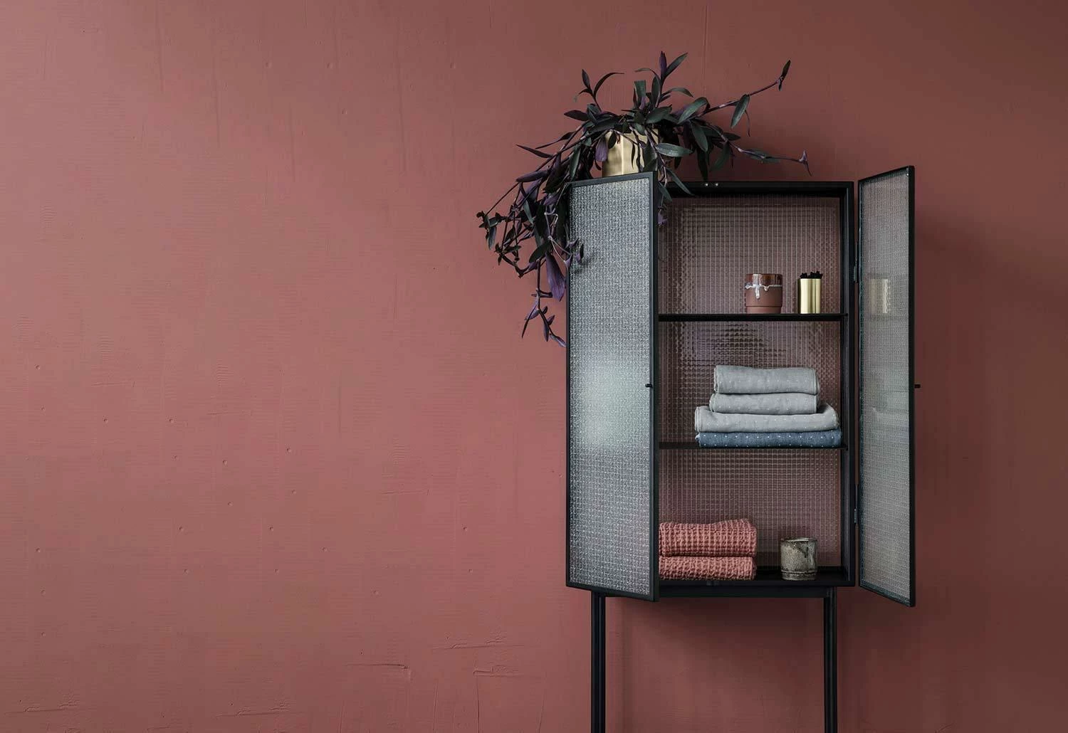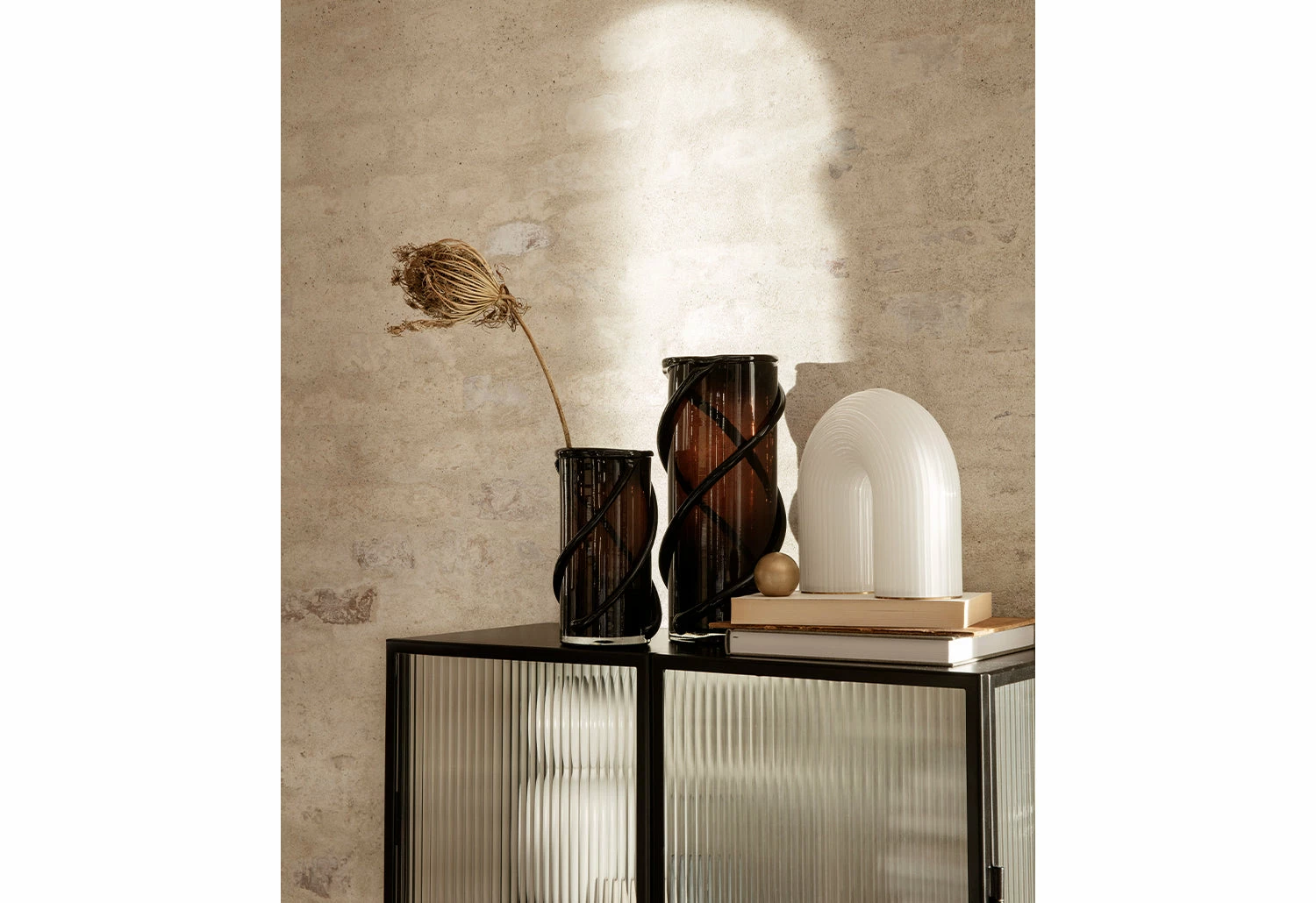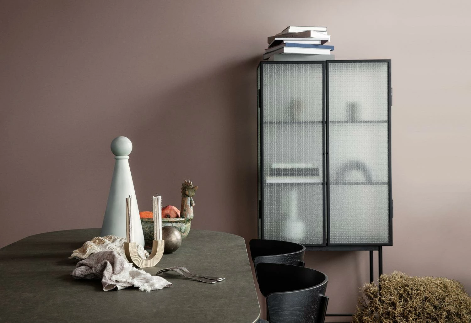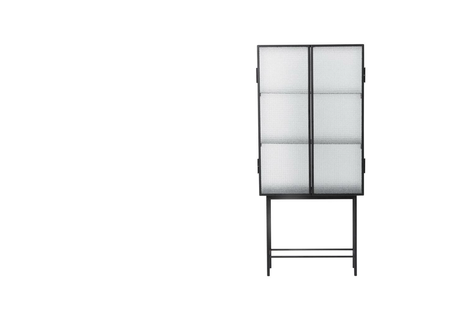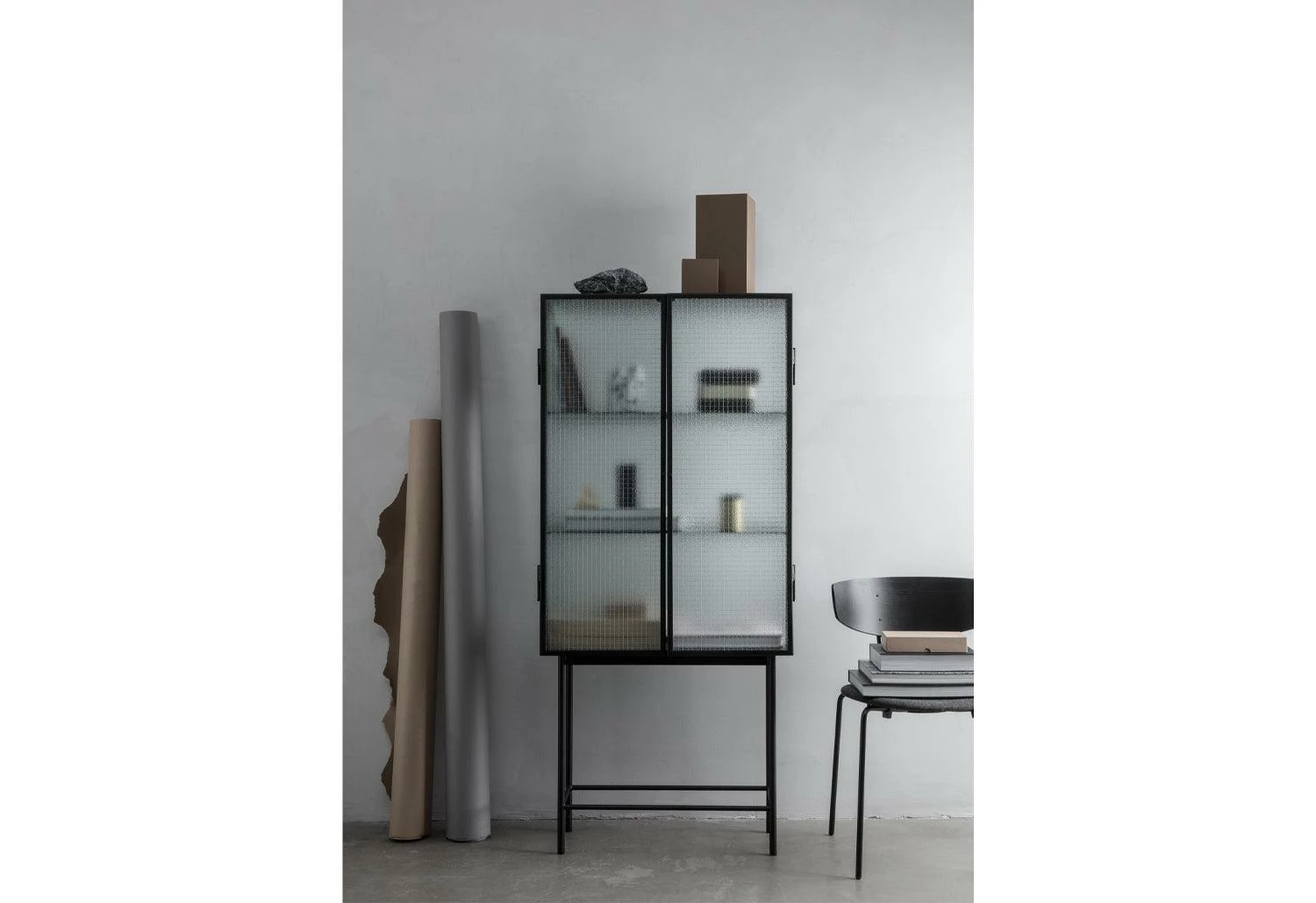 Designed in collaboration with Says Who, the Haze vitrine is inspired by the industrial and raw character of wired glass. The display cabinet’s modern design features textural wired glass supported within a sleek black metal frame.
