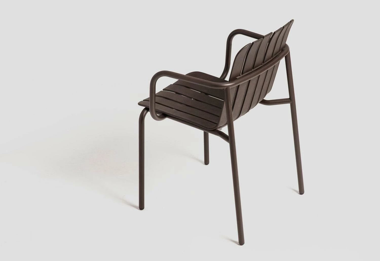 Available in three warm-toned hues – brick red, grey brown and natural. The tubular steel frames are powder coated in matching colours, with an outdoor grade finish. Available with or without arms.
