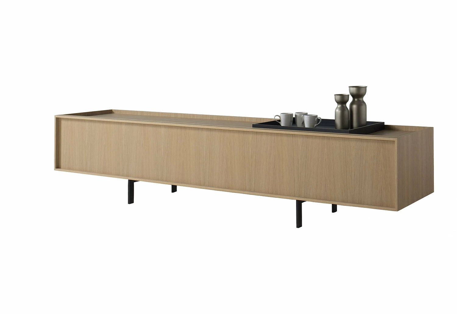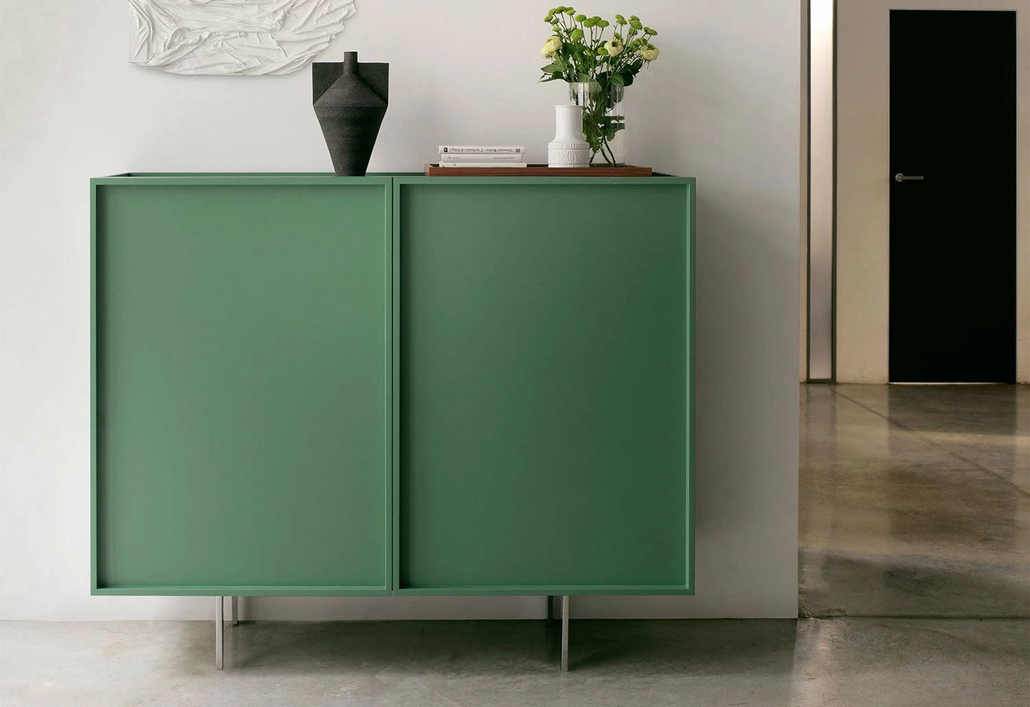 The Lochness cabinets come in three styles; the long cabinet and the regular cabinet, which have a single flap door, and the sideboard, which has two hinged leaf doors that open outwards. The low-line storage unit is available in various finishes and colours to suit any interior, ideal for scheduling your home or office.