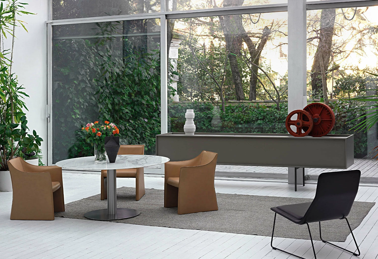 The Lochness range by the renowned Italian designer Piero Lissoni comprises a sideboard, a cabinet, a dining table and a writing desk. United by their metal frames and range of materials, the series was envisioned for use in the living room or commercial spaces.