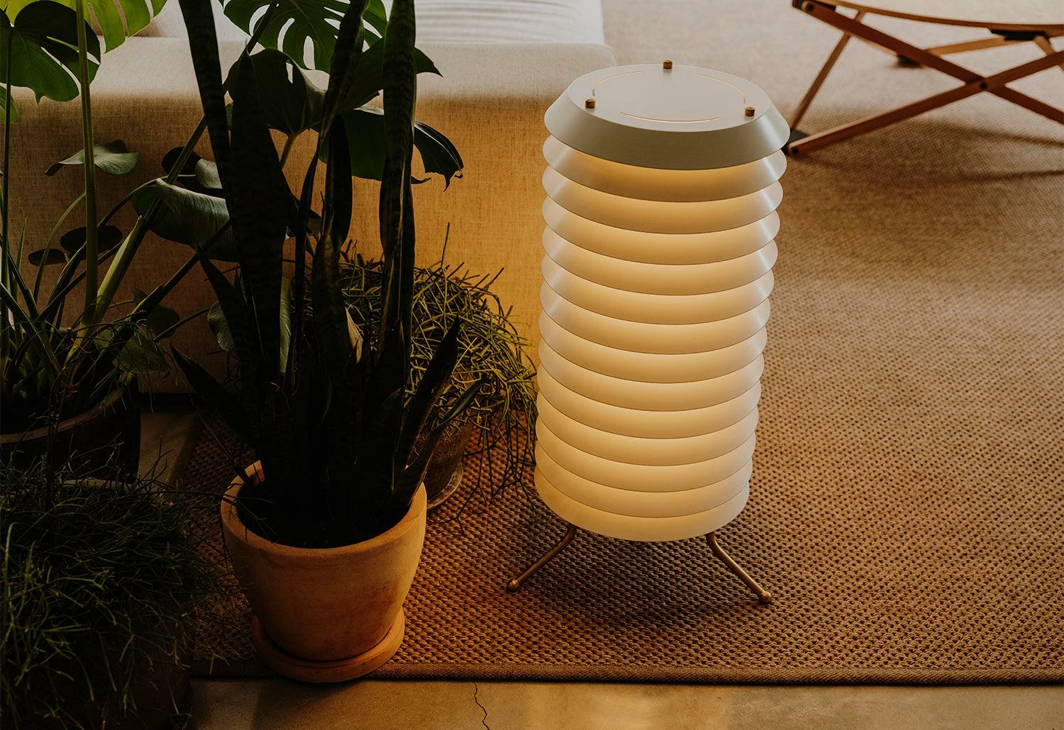 The Maija 30 floor light is inspired by the form of a beehive. It has an opaque body, fragmented by superimposed plates which filter the inner light.