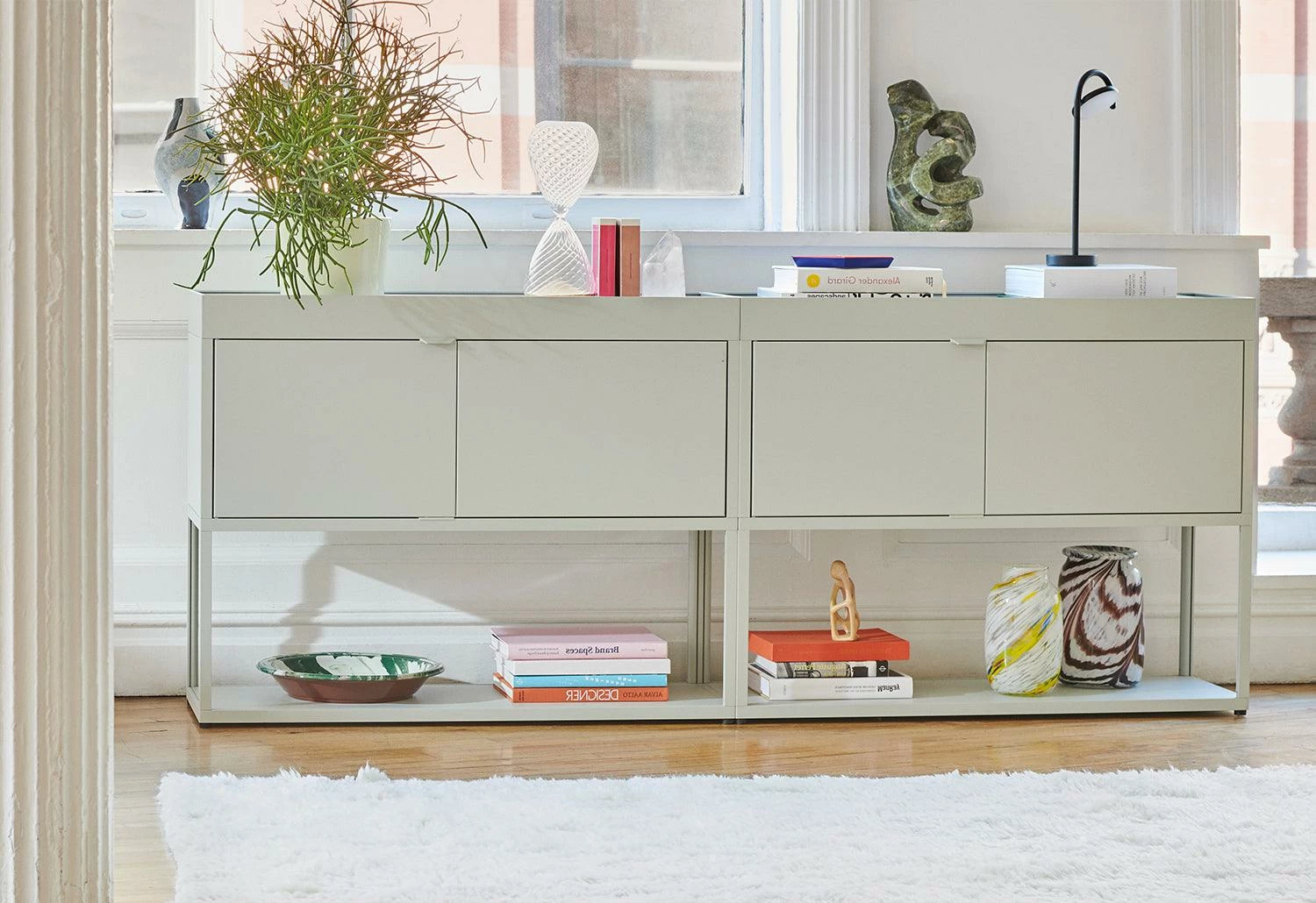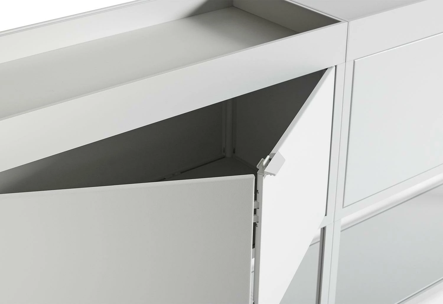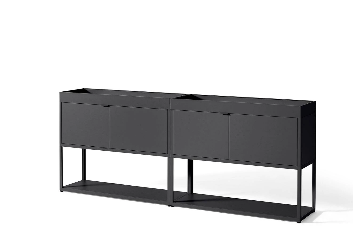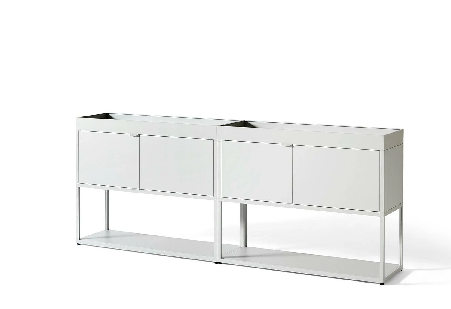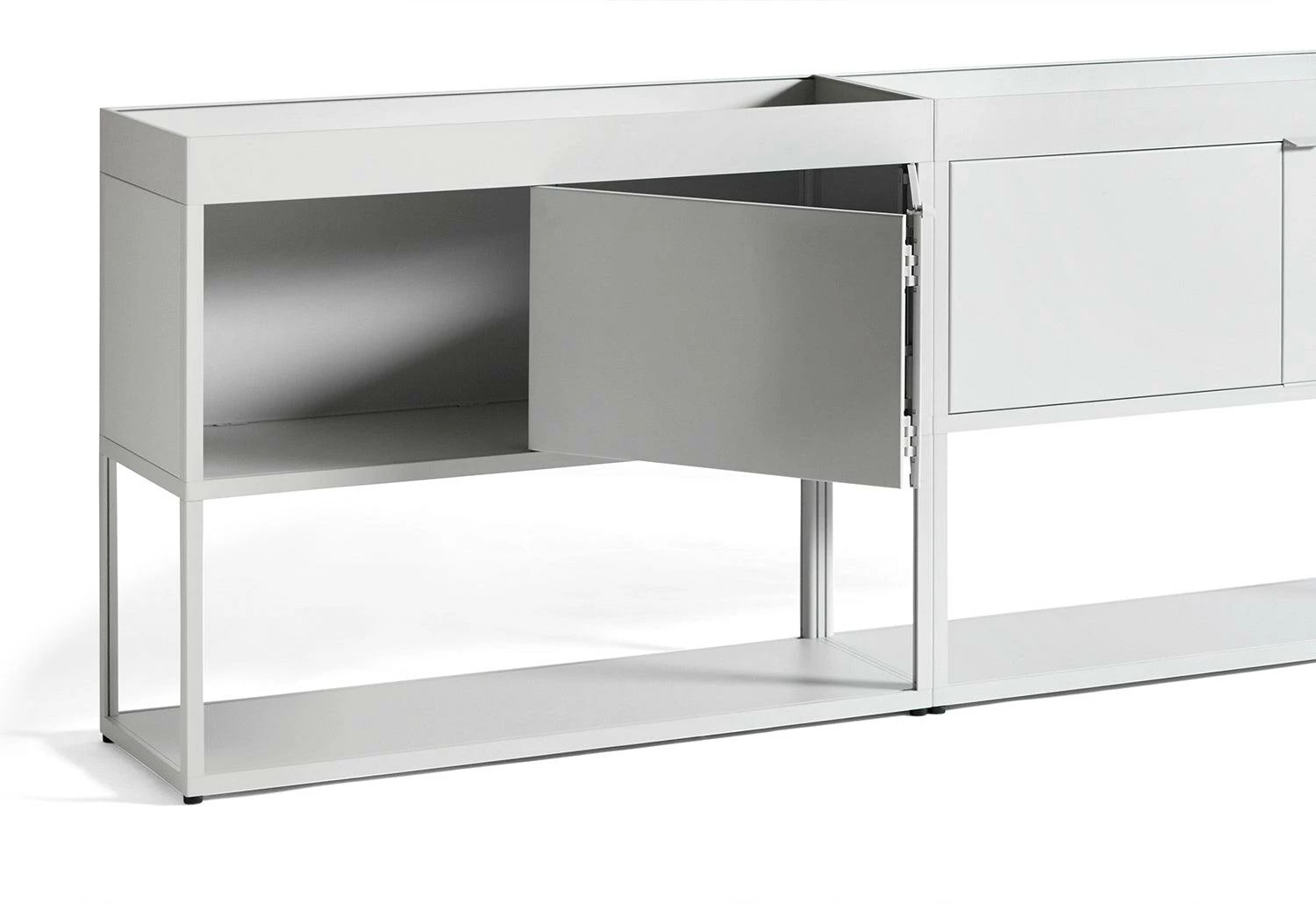 New Order’s open-ended, modular system comprises interconnecting aluminium elements to create customised storage solutions for specific workspace and living areas. The combination features an open shelf, closed cupboards and upper tray. This configuration fulfils a broad range of organisational and storage requirements. The closed doors efficiently conceal the contents while the open-top trays securely accommodate a variety of small or large objects.