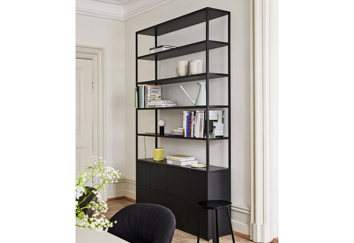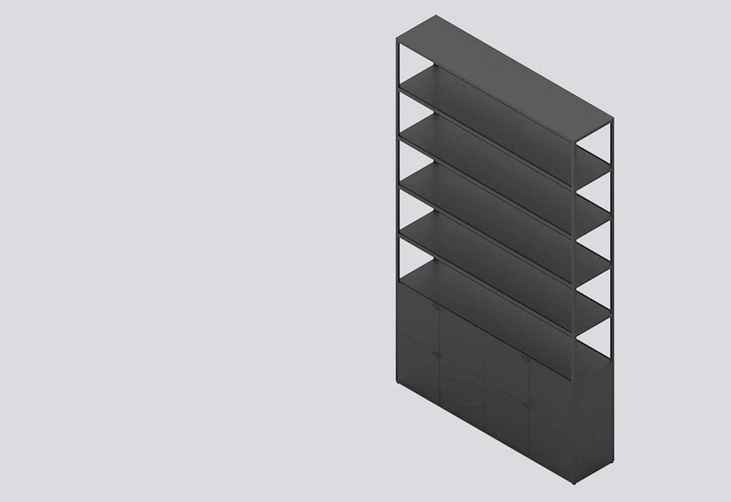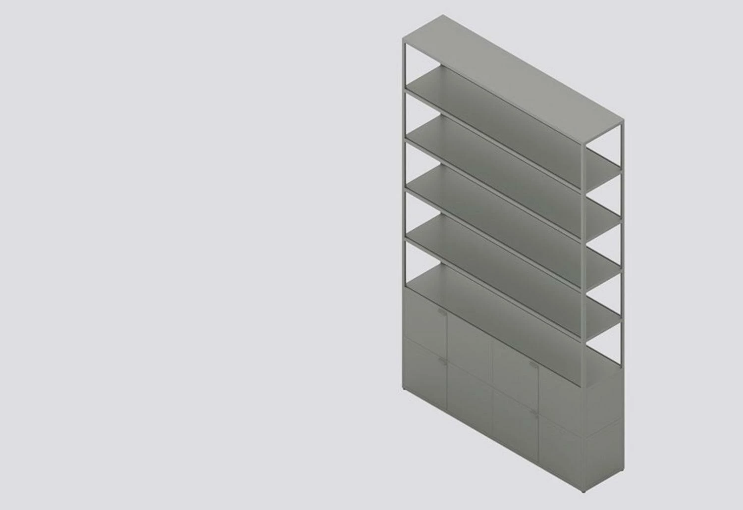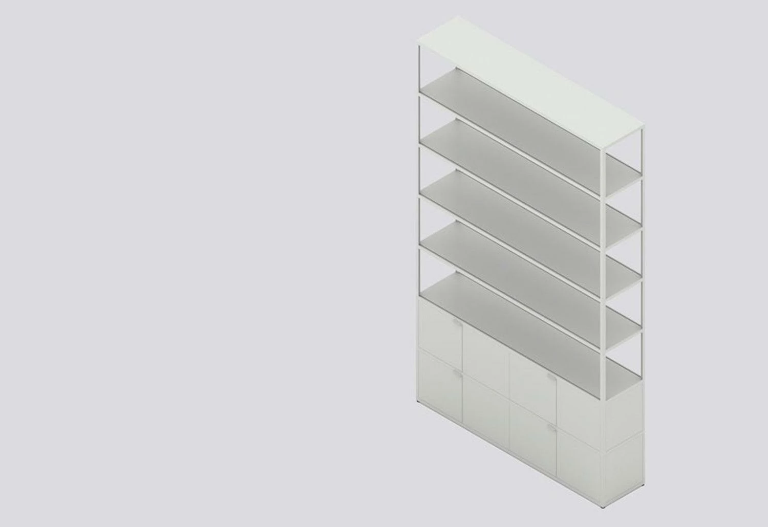 The combination offers a flexible solution featuring open shelves and closed storage space. A functional and elegant storage solution with integrated sliding doors made of powder-coated steel which matches the colour of the grid to create a seamless, uniform appearance or customised with contrasting colours.