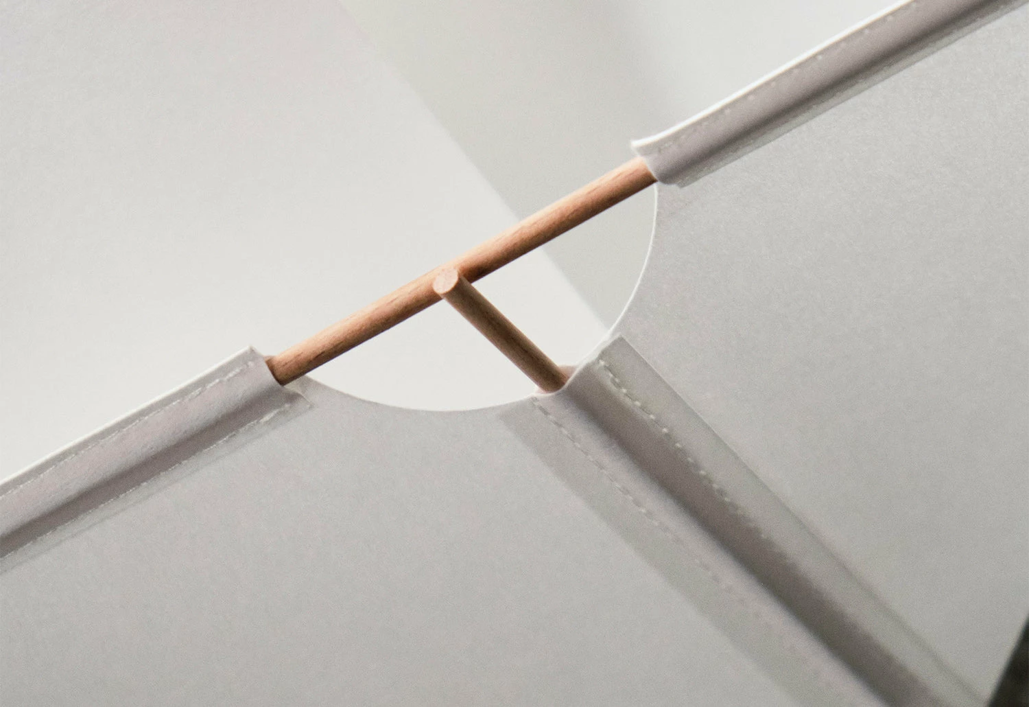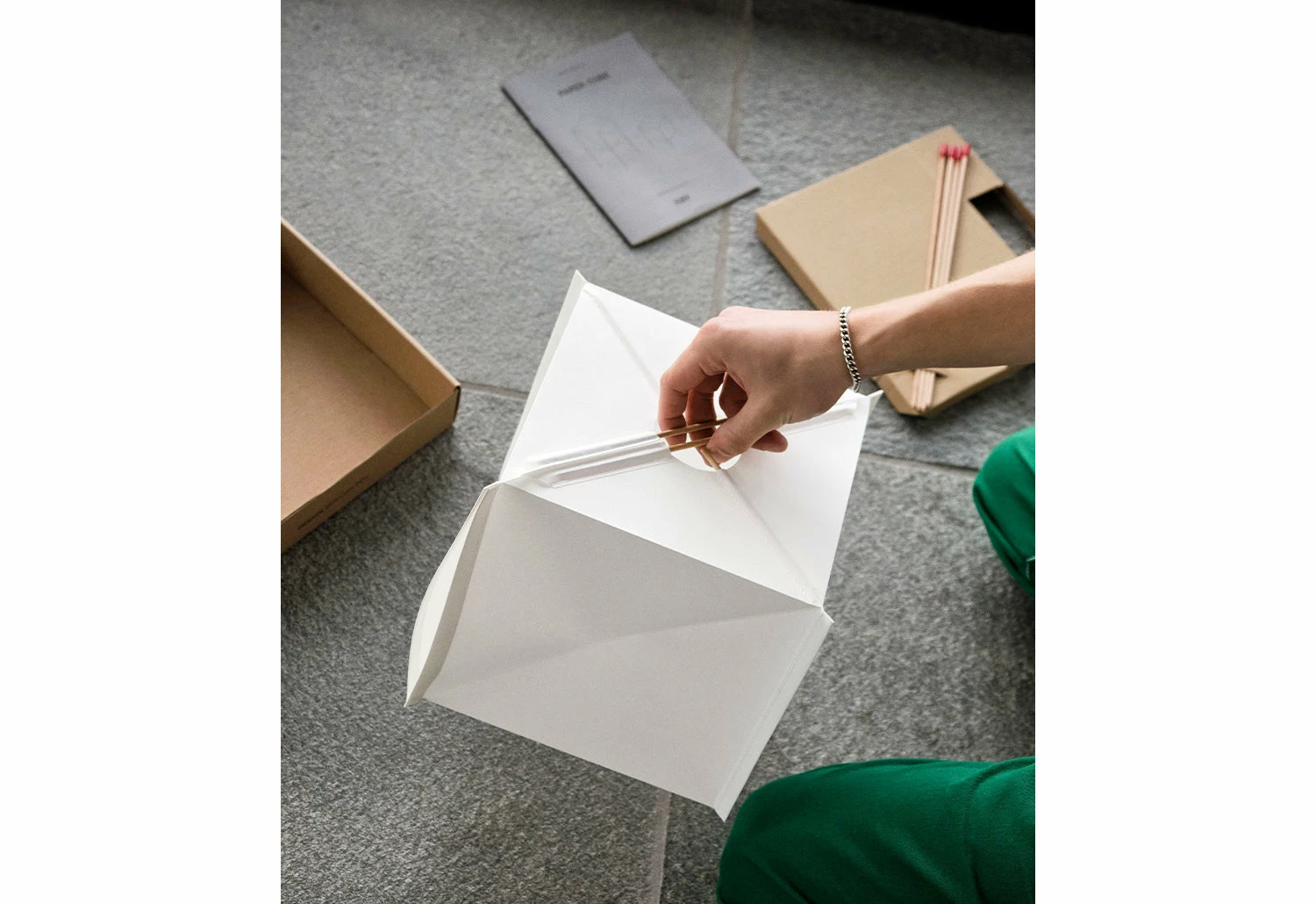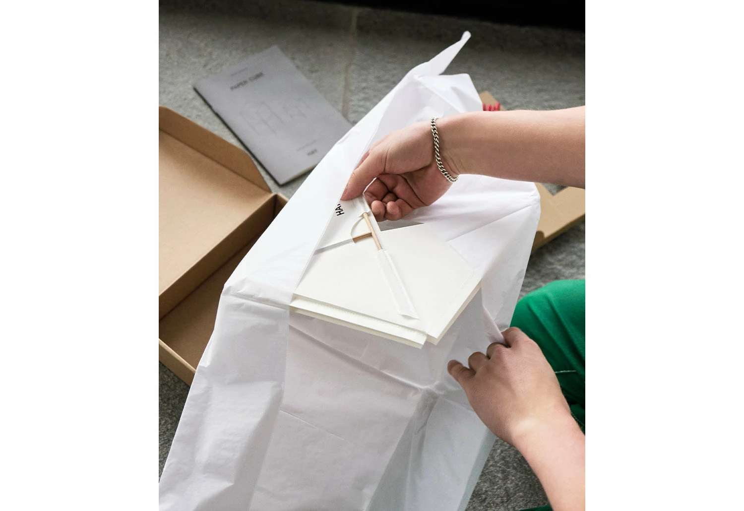 Flat-packed and easy to assemble, the table lamp is constructed from a strong Japanese paper material made from recycled PET bottles. The legs are made with FSC-certified beech.