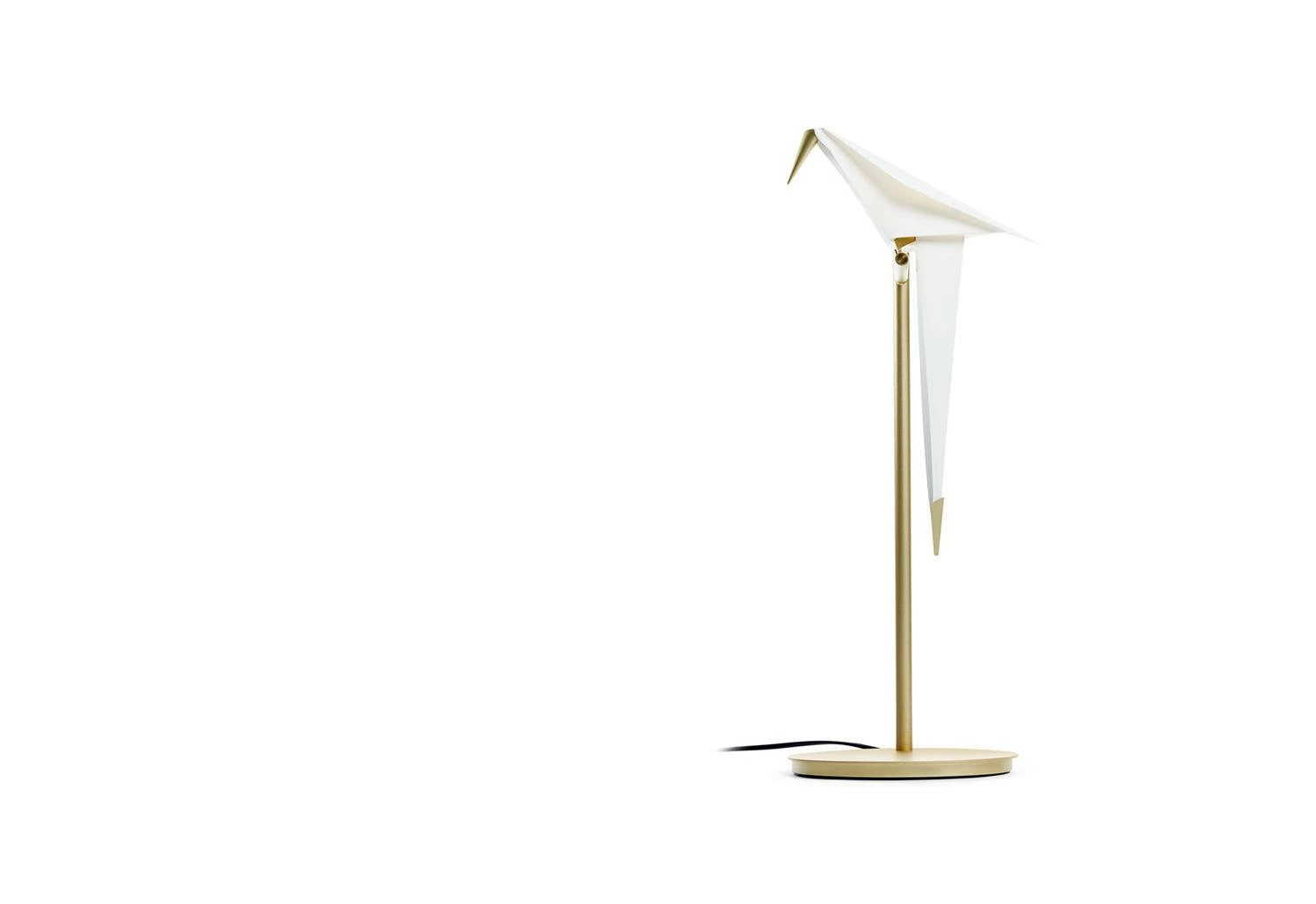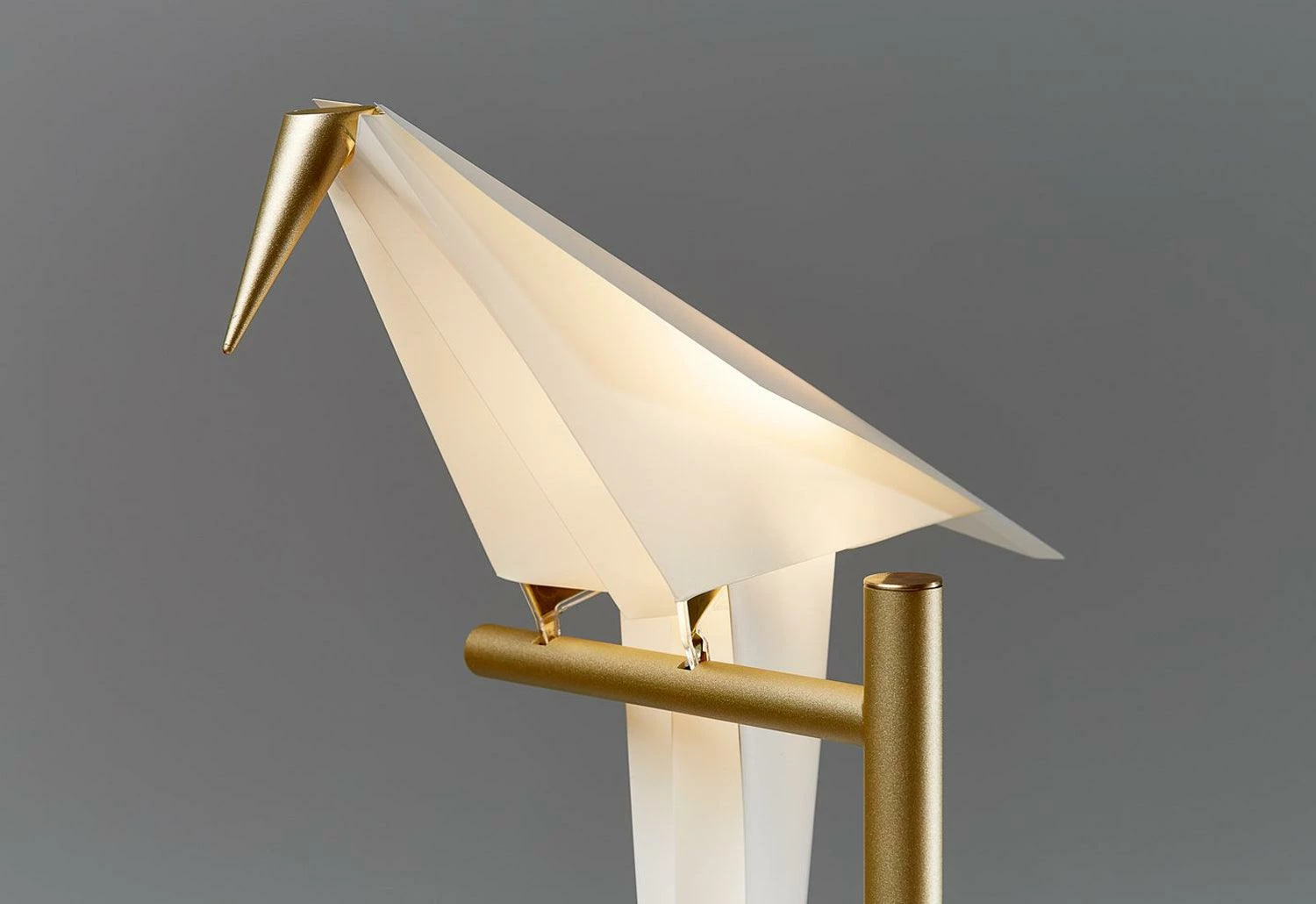 Reminiscent of origami forms, the bird light features a white body with elegant brass coloured detailing. A charming addition to any space, this sculptural table lamp emits a warm glow when lit.