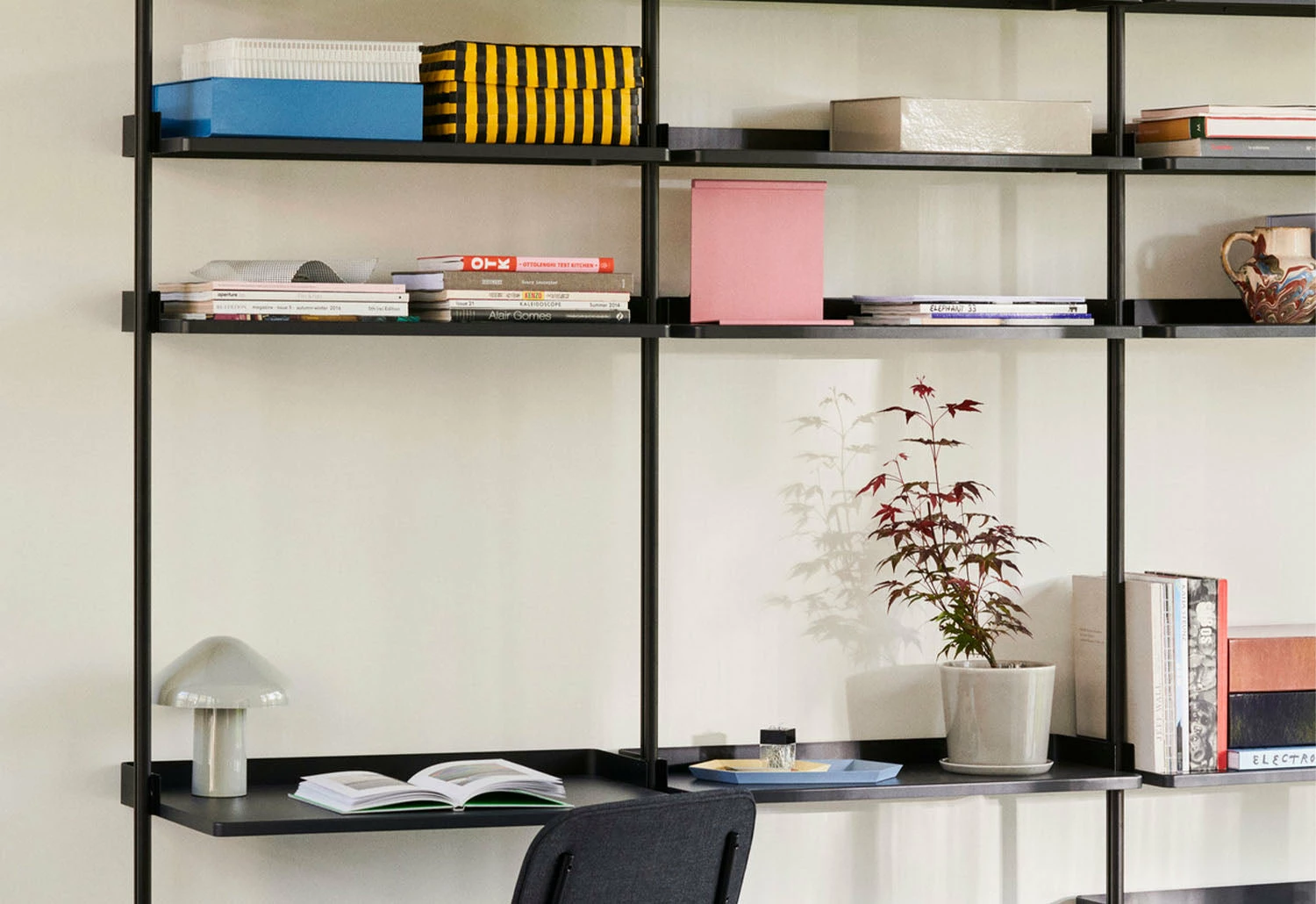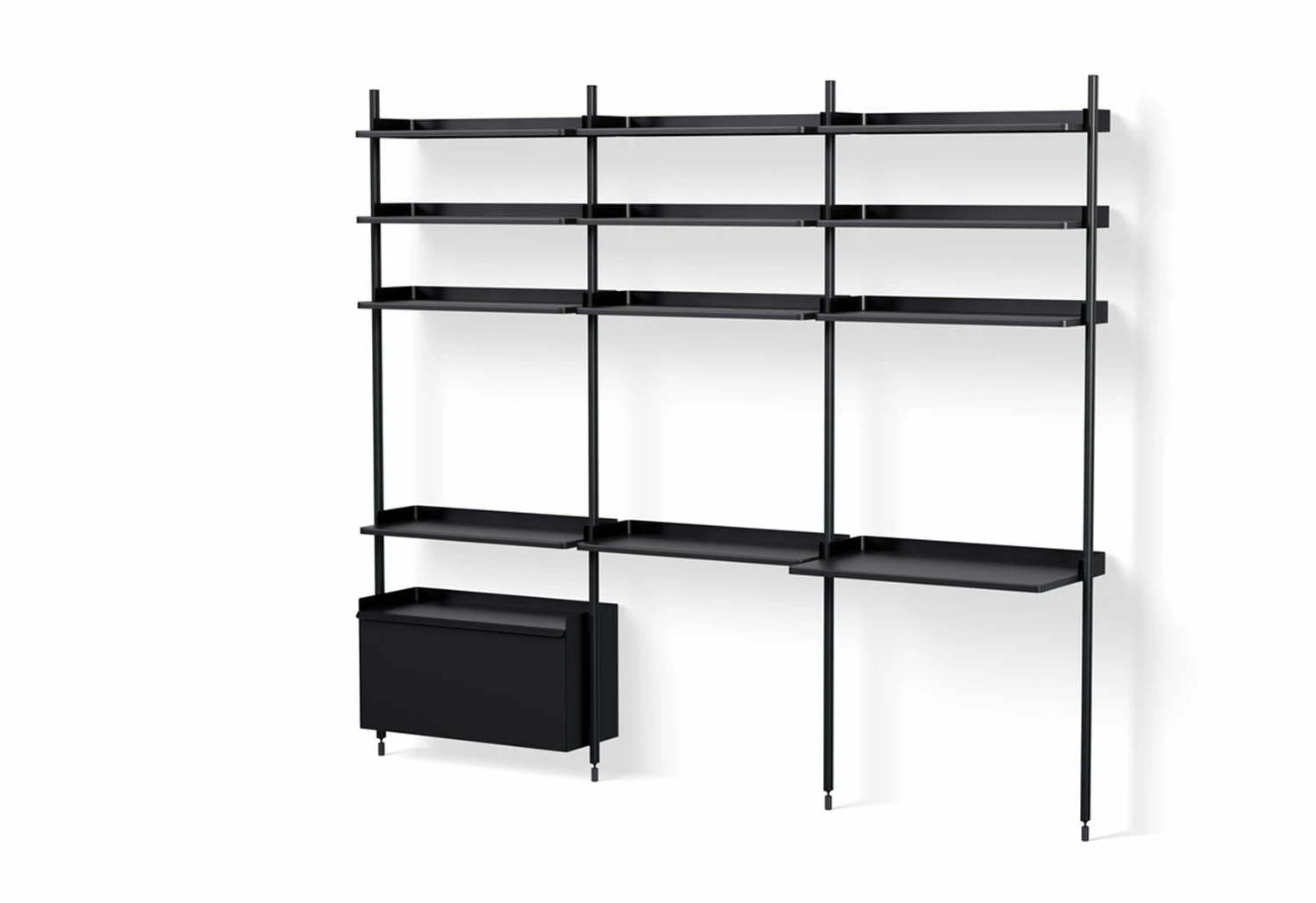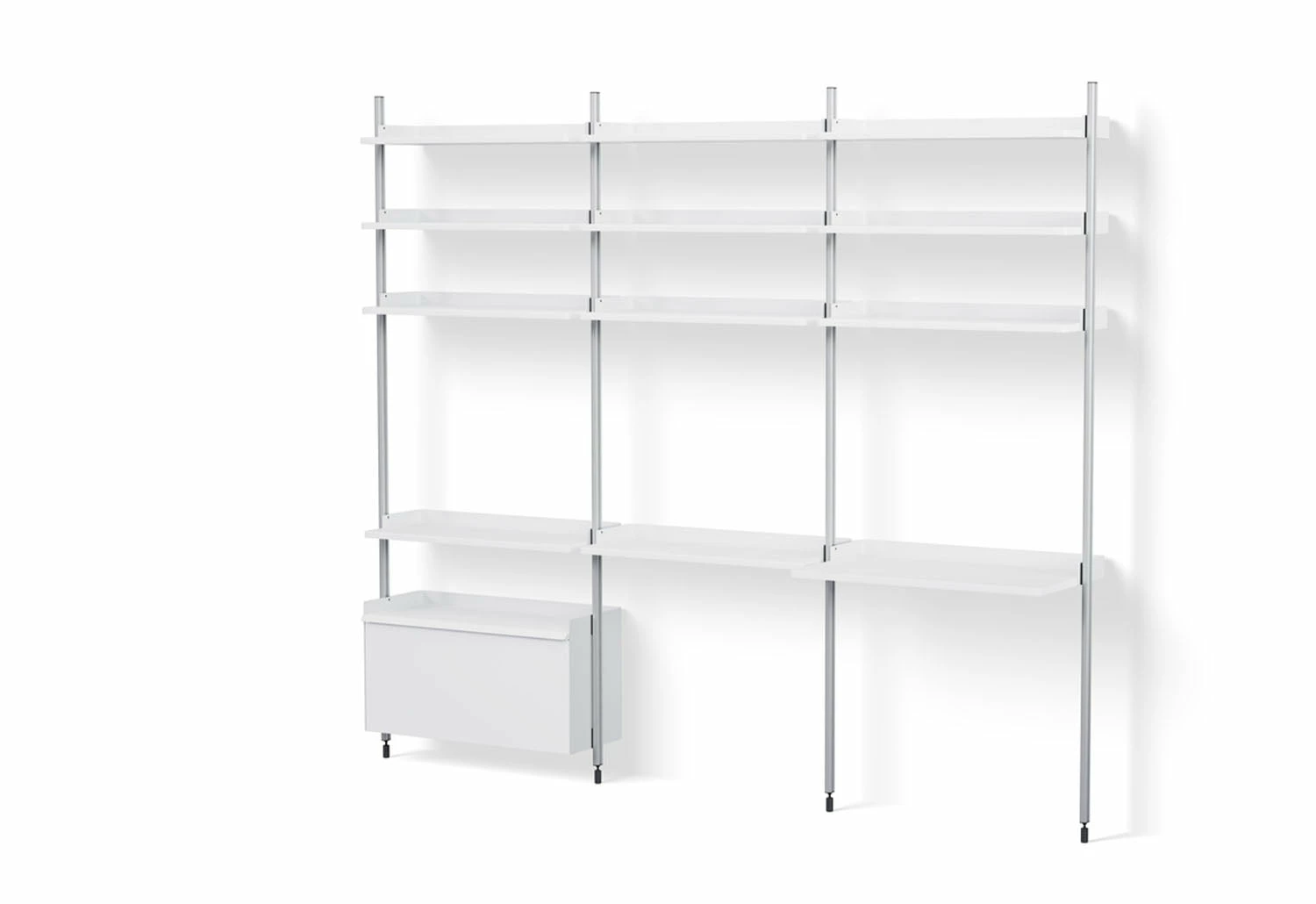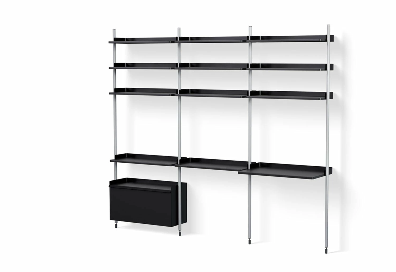 The minimalist shelving is available in several colours and pre-configured combinations, which include practical elements such as flat shelves, wire shelves, work desks, cabinets and clothing hooks. The combinations can be used alone or combined to create custom systems for your environment.