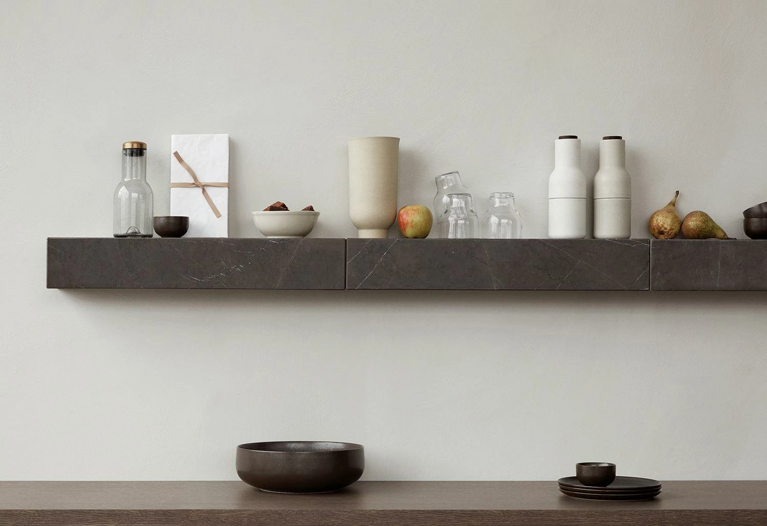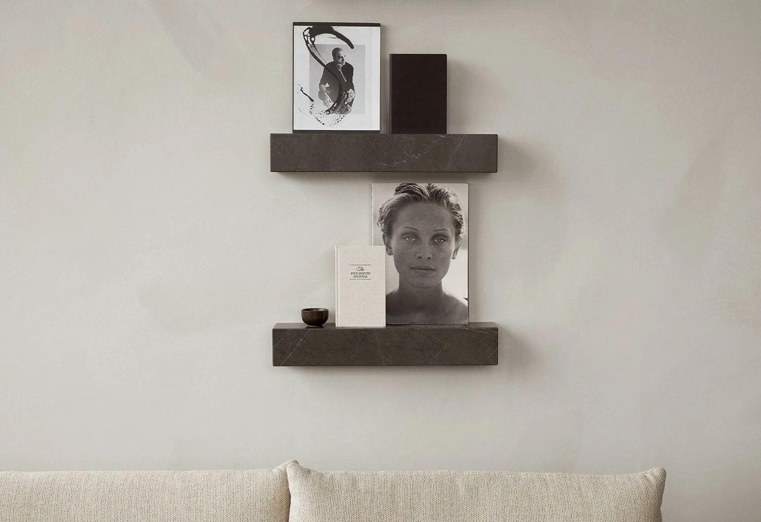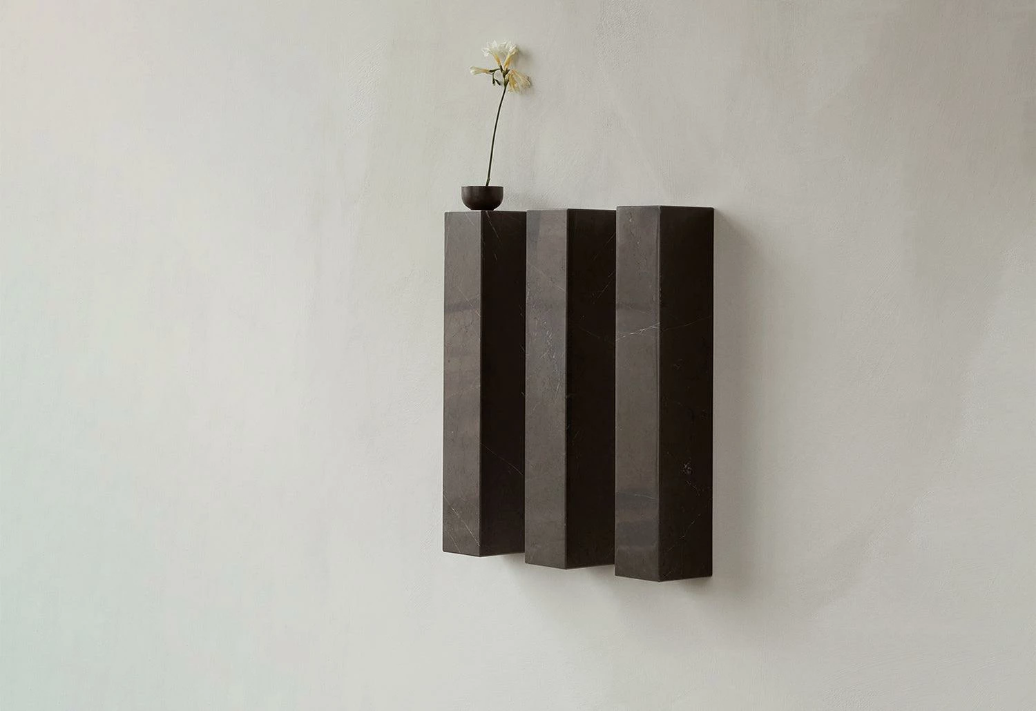Menu’s Plinth Shelf is constructed from Grey Kendzo, a rich and beautifully light-reflecting white veined marble. A minimal design, the Plinth Shelf can be hung in singles, or grouped together, to create a custom shelving system. The 60 cm long shelf can be attached to a wall horizontally for use as a bookshelf or display ledge, or vertically as a wall-mounted podium to display a special object.
