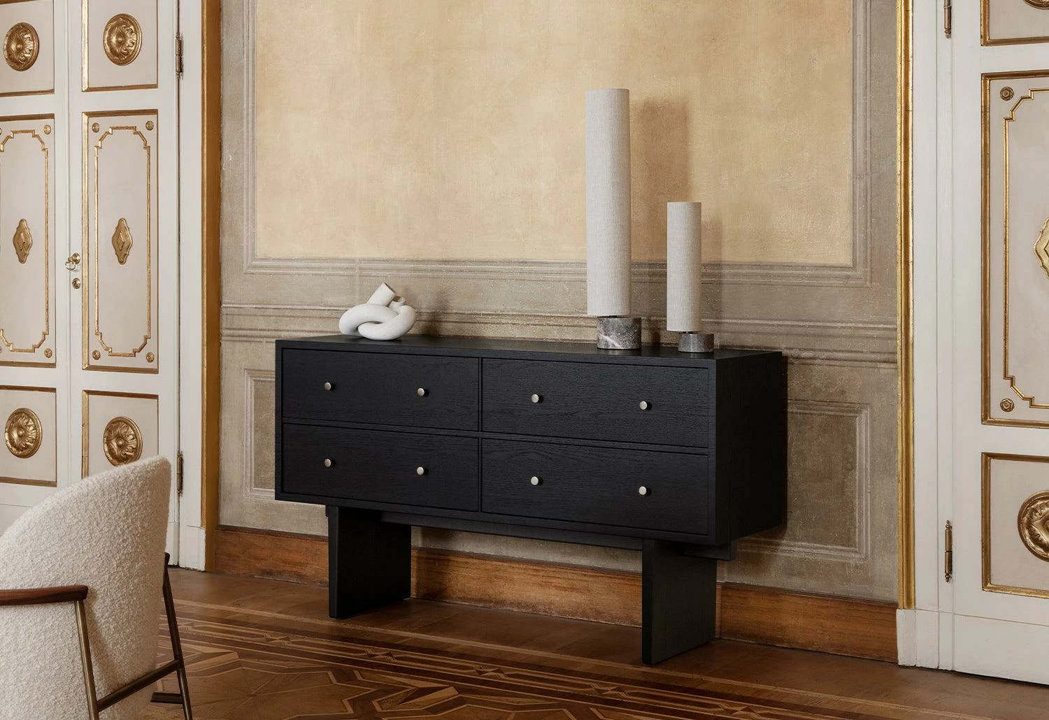 The Private Sideboard offers a great storage solution for homes or offices without compromising with style. The elegant sideboard features four drawers in brown or black stained lacquered oak finish. The base features a brown or black stained veneer lacquered oak.