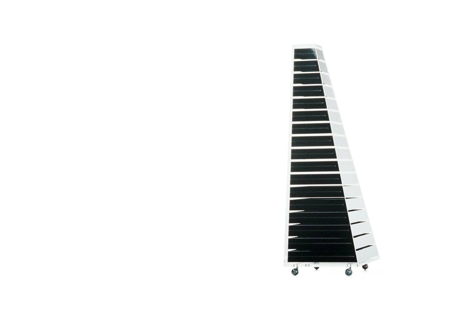 Designed by the Japanese designer Shiro Kuramata, Pyramid is a chest of drawers with a pyramid-shaped structure and black rubber wheels with chromed metal carters.
