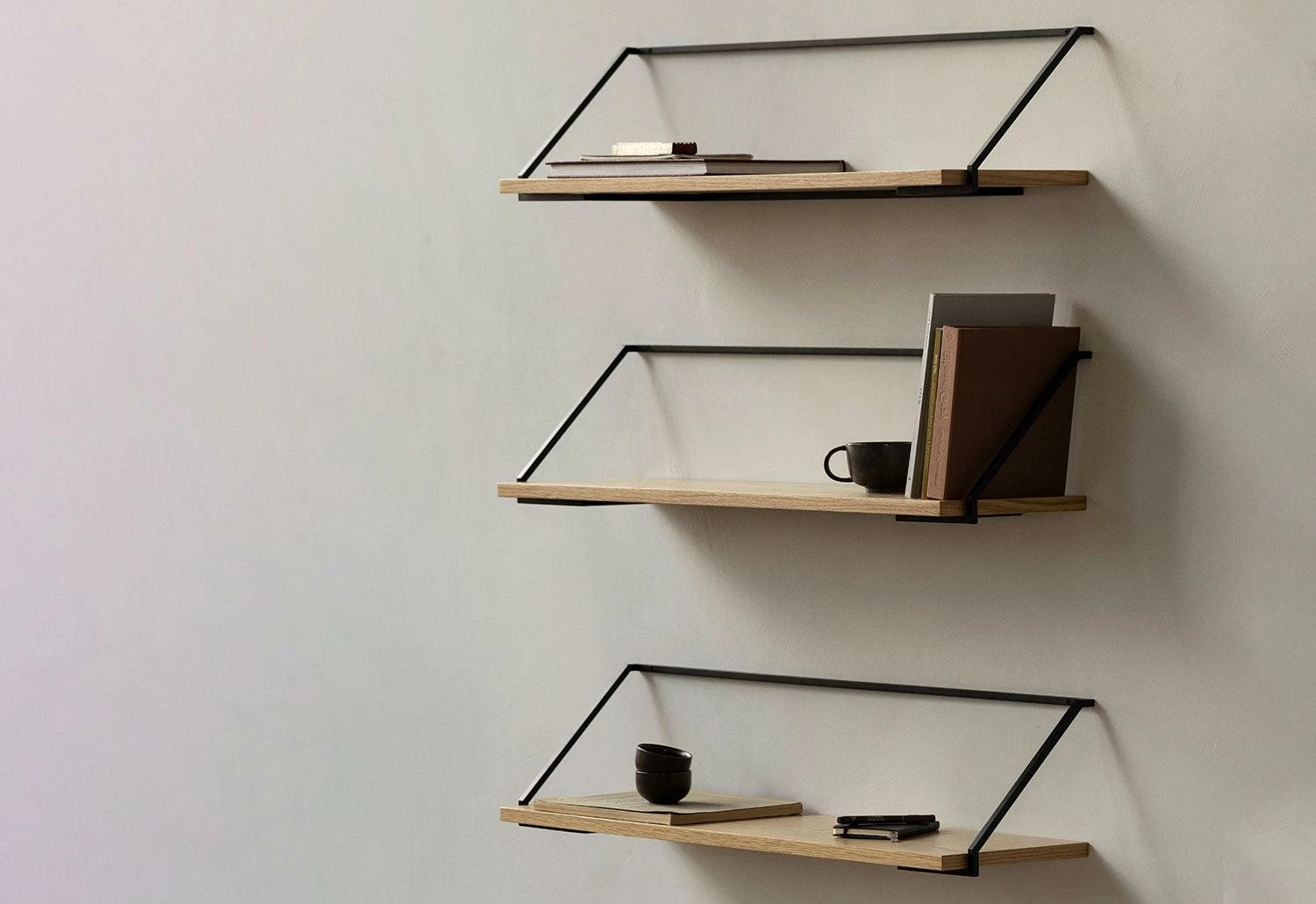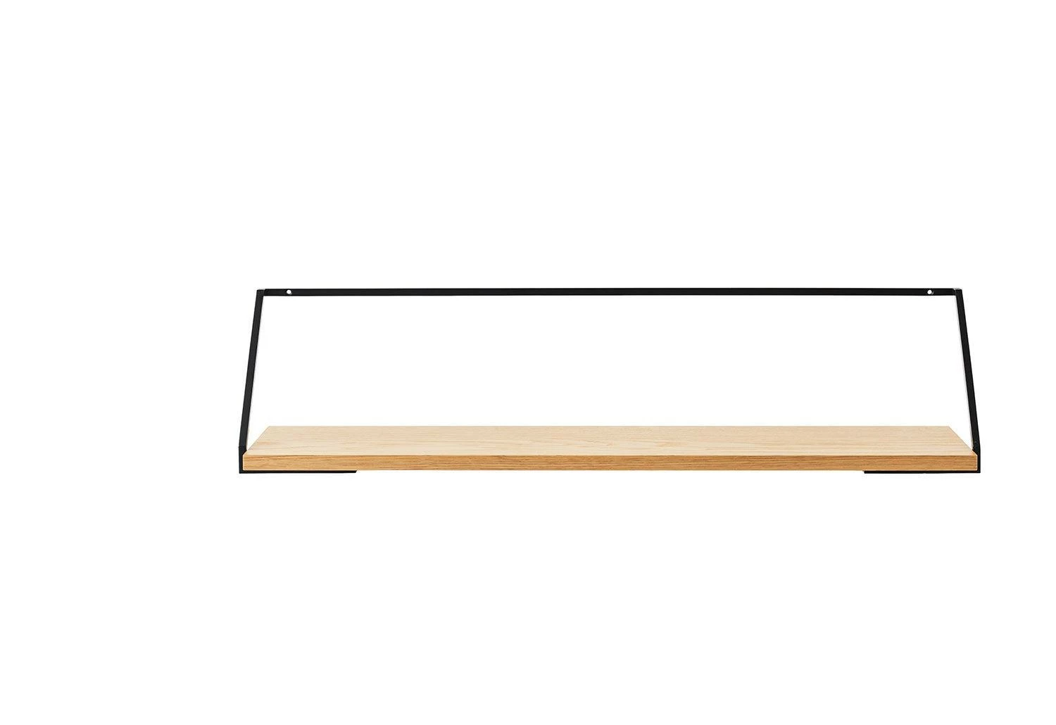 Comprised of a lightweight steel bracket and a minimal wooden shelf, in natural or dark stained oak. The modern shelf fits into spaces small or large and can be suspended alone or in rows to suit specific functional and aesthetic requirements.