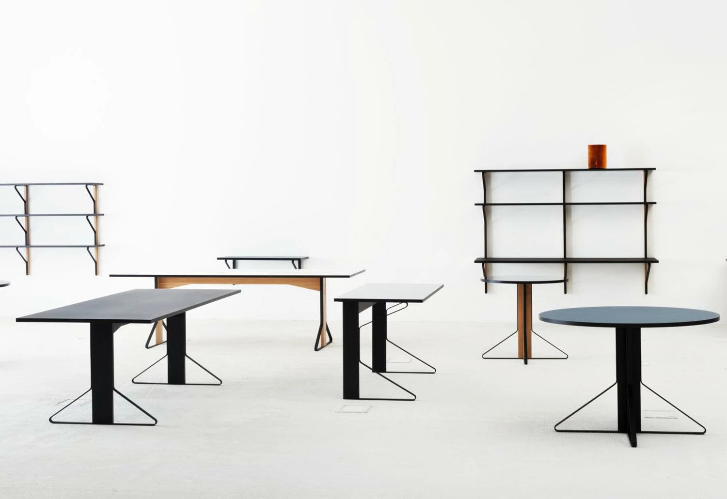 The Kaari Collection is the result of the first collaboration between the French designer brothers and Artek. Based on a simple, yet intelligent standard component of a metal loop, Kaari – meaning ‘arch’ in Finnish – is a collection that comprises rectangular and round tables as well as a desk, a wall console, a wall hook, a small round shelf, and larger shelves.