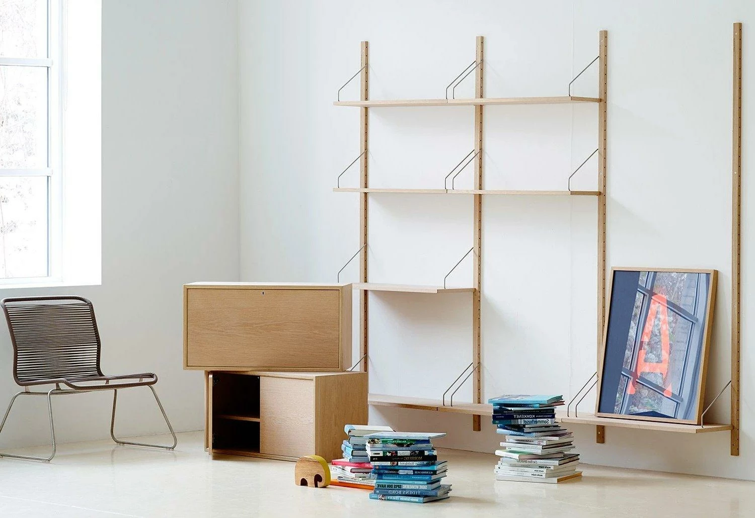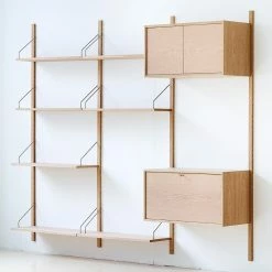The Royal System was conceived by the Danish designer in 1948. Recognised with Gold Medal at Finland Furniture Fair in 1950 and silver at Milan Triennale, the system set a benchmark for wall storage design. In oak and walnut, the system is produced to exacting standards and offers great flexibility to extend or reconfigure.