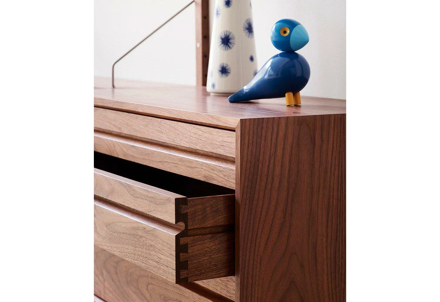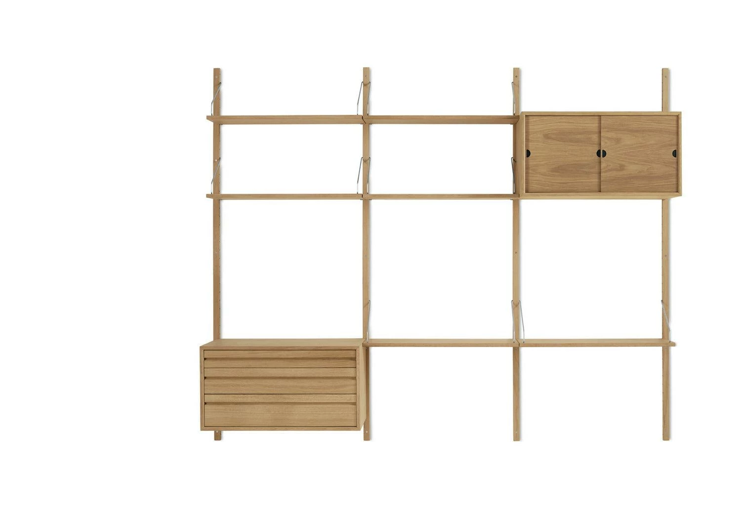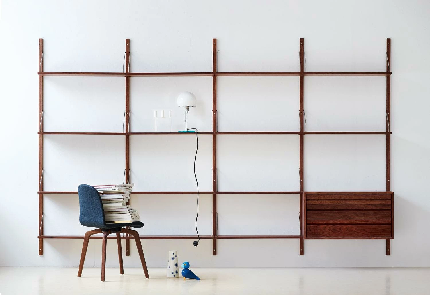 The Royal System was conceived by the Danish designer in 1948. Recognised with Gold Medal at Finland Furniture Fair in 1950 and silver at Milan Triennale, the system set a benchmark for wall storage design. In oak and walnut, the system is produced to exacting standards and offers great flexibility to extend or reconfigure.