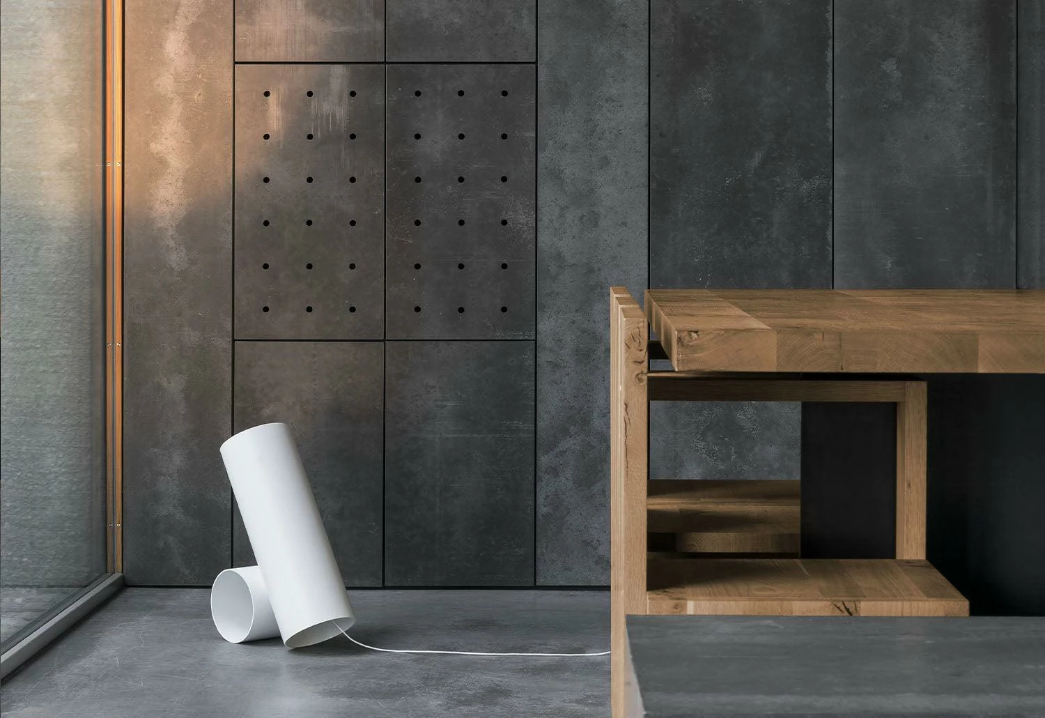 The Sawaru floor light is composed of two cylinders, one supporting the other. The angle of the light source can be adjusted in three stages of 25, 40 or 60º by inserting the pin attached to the base.