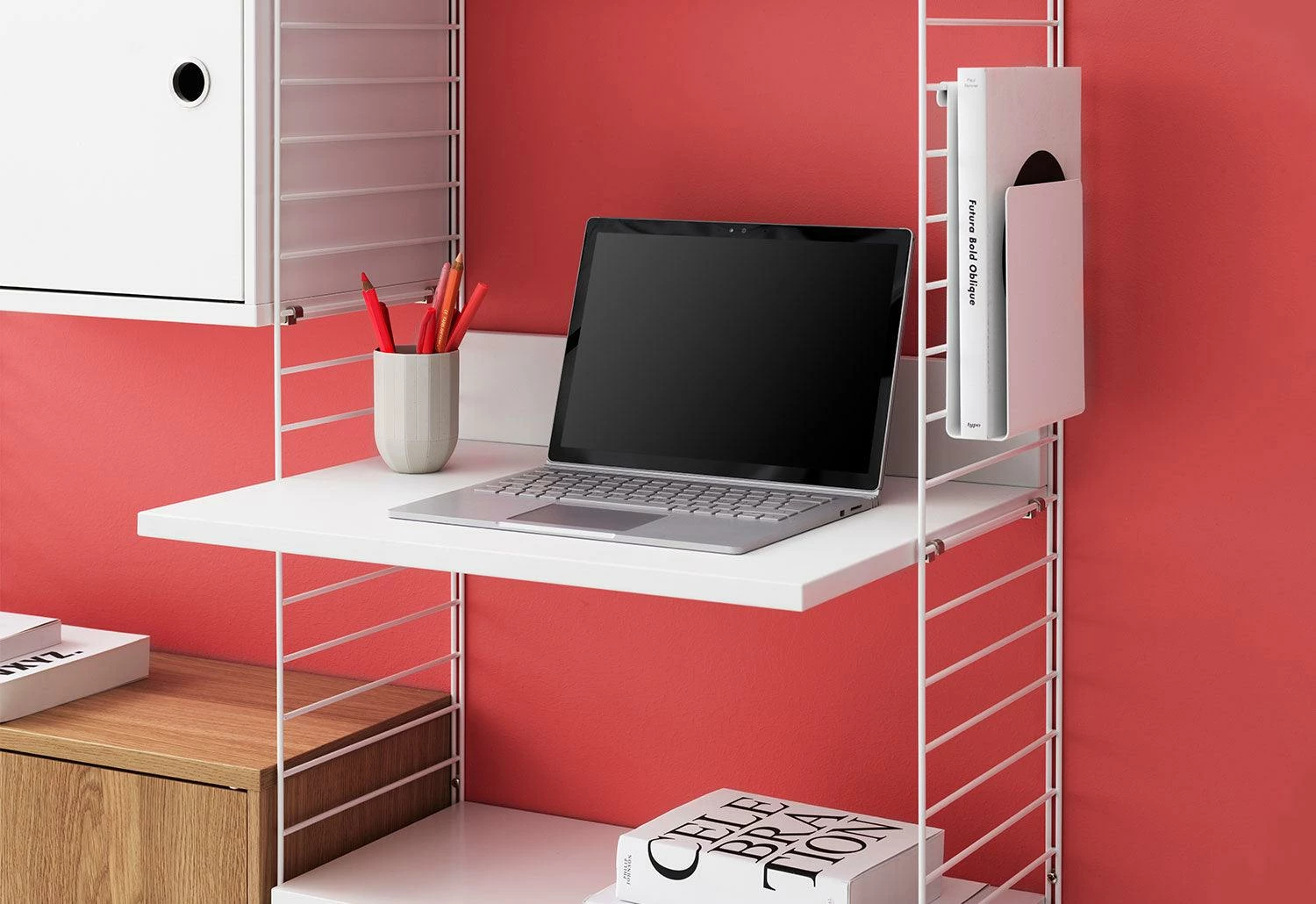 The String System is a robust and versatile shelving system offering different shelves depths, which can be combined and enriched with separate filing or display cabinets, magazine racks, table, drawers, desk, etc. modules.