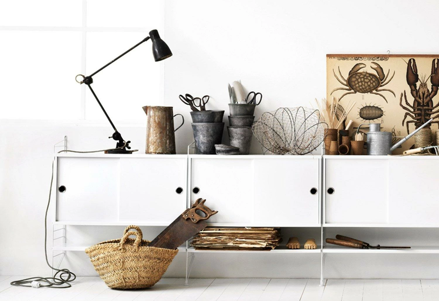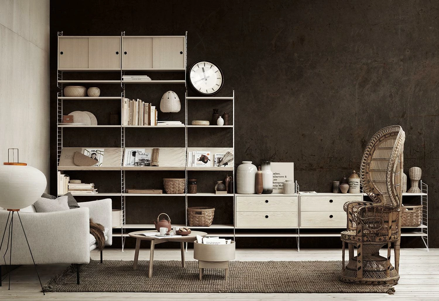 The String System is a robust and versatile shelving system offering different shelves depths, which can be combined and enriched with separate filing or display cabinets, magazine racks, table, drawers, desk, etc. modules.