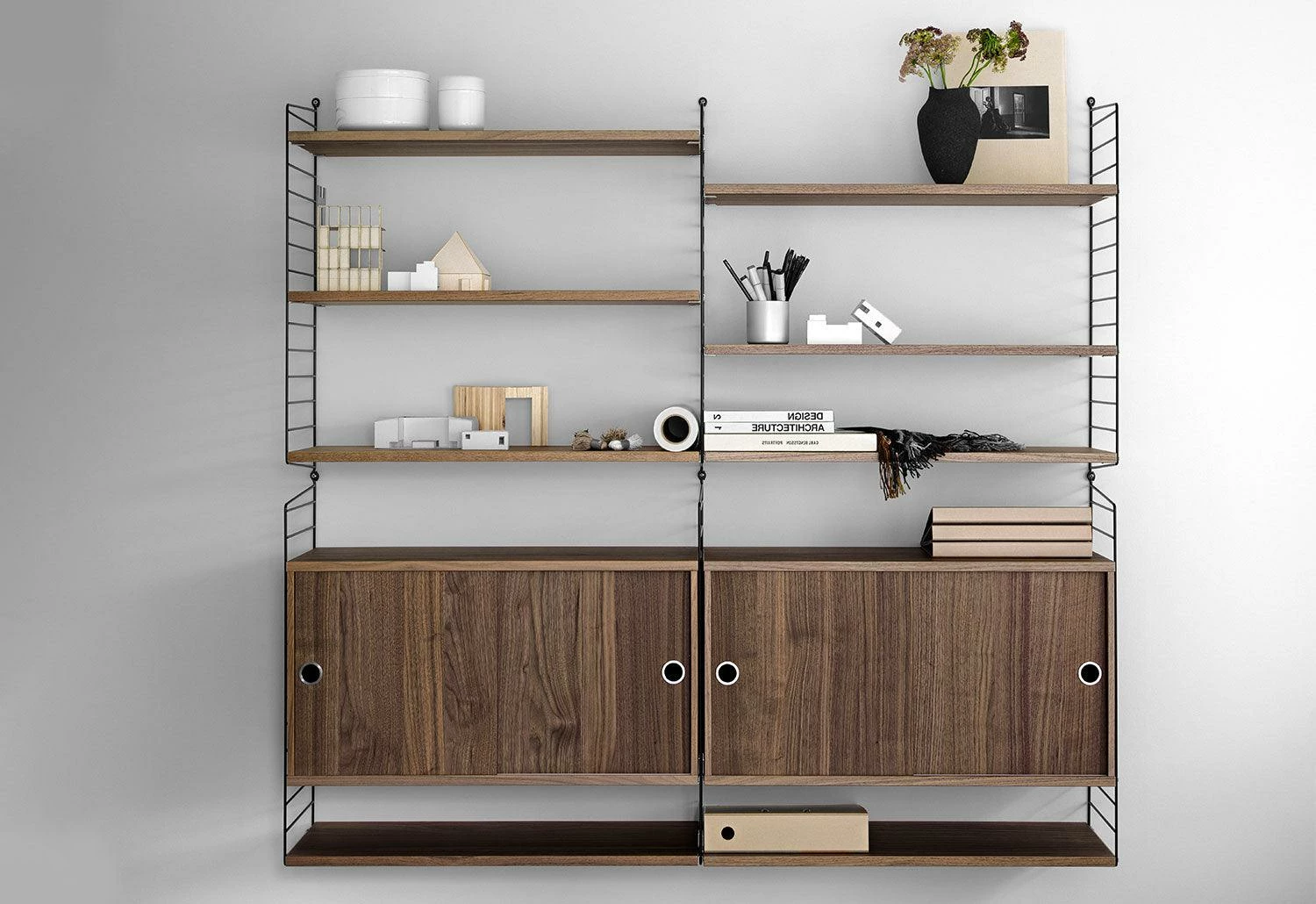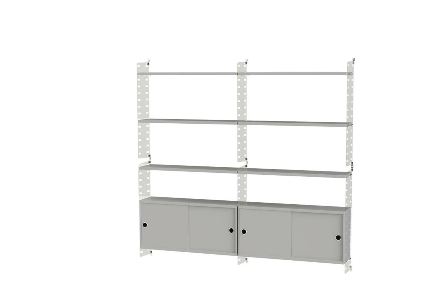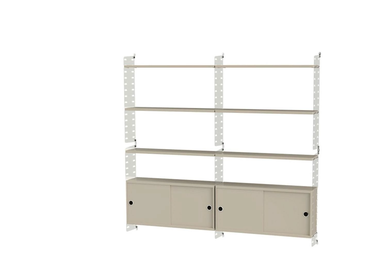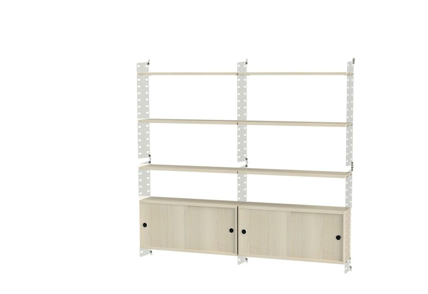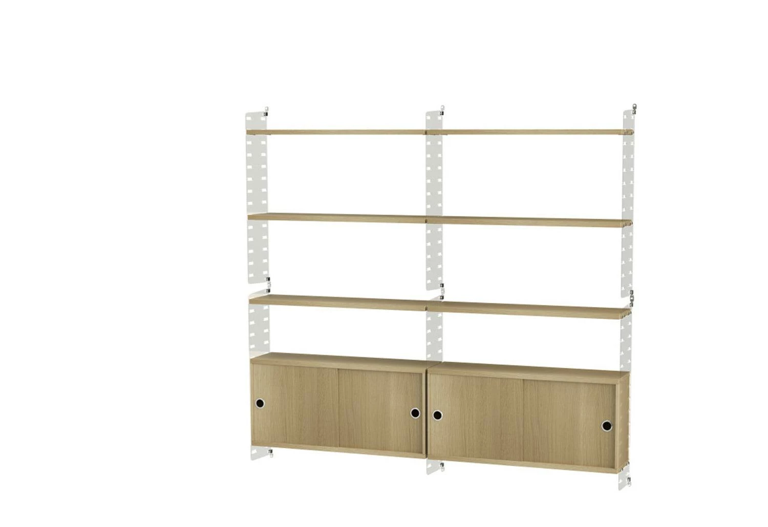 The String System is a robust and versatile shelving system offering different shelves depths, which can be combined and enriched with separate filing or display cabinets, magazine racks, table, drawers, desk, etc. modules.
