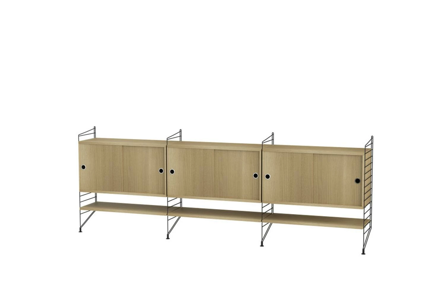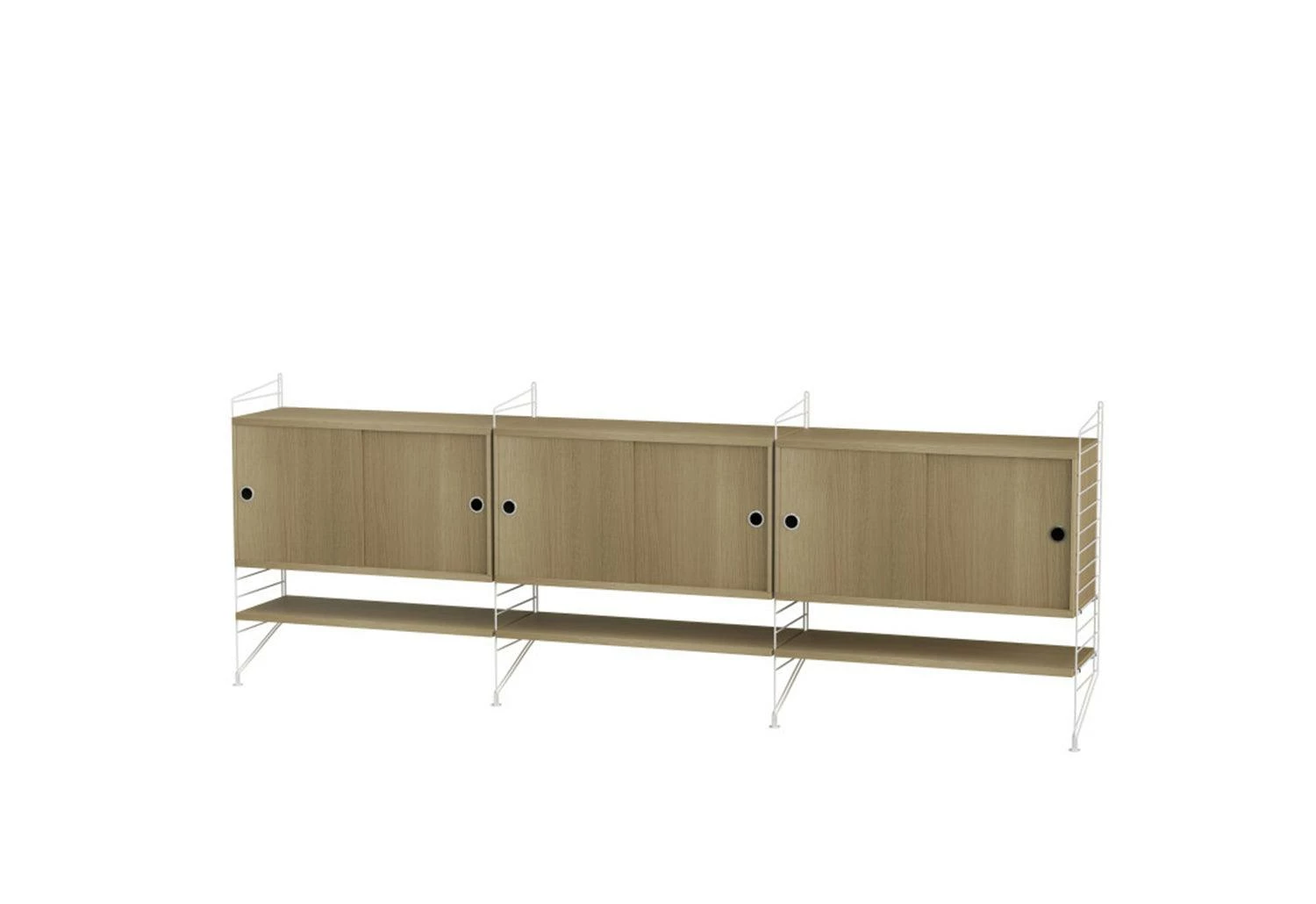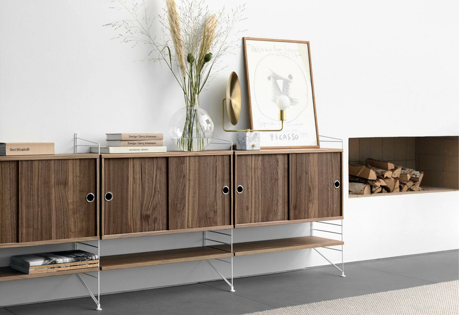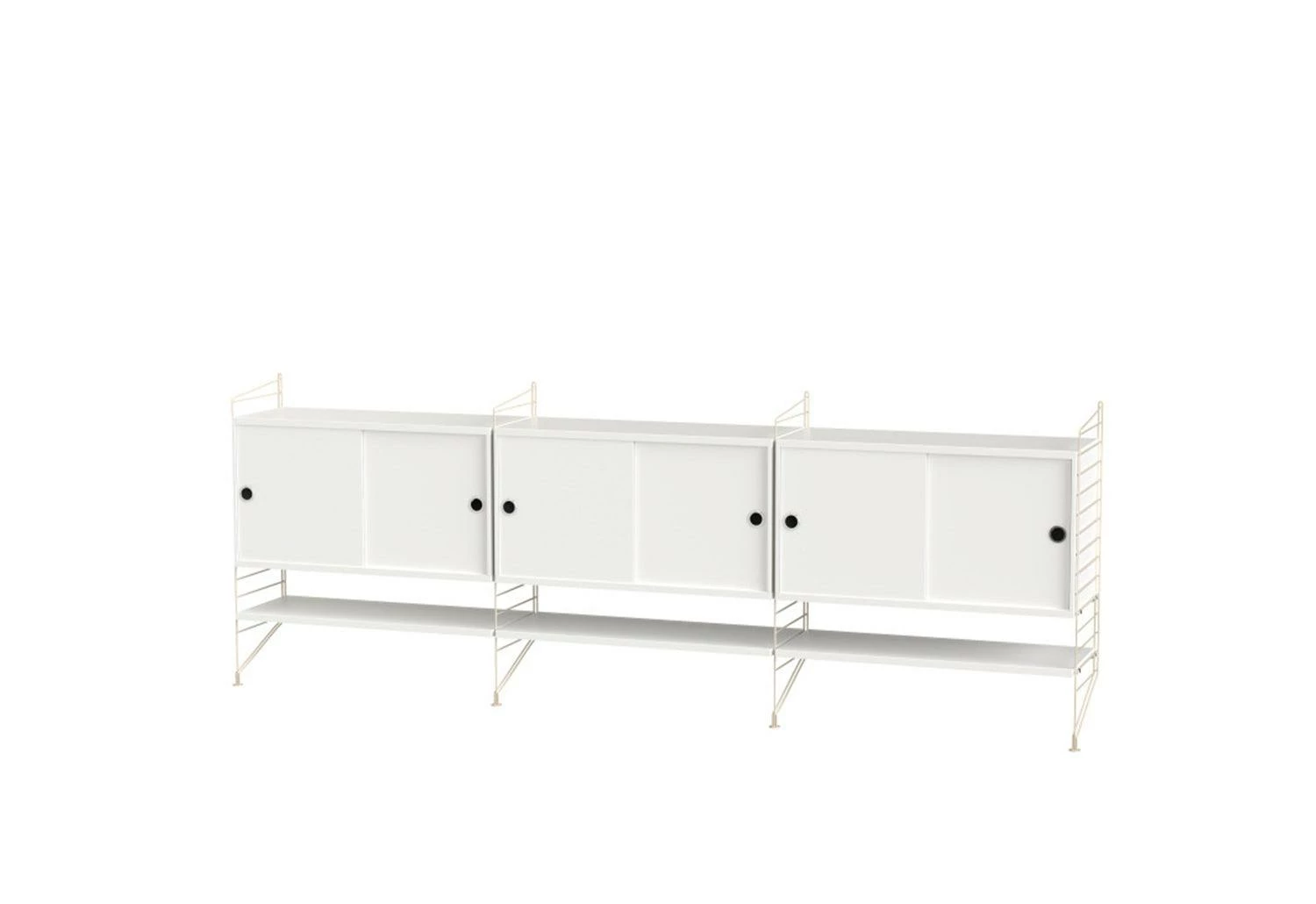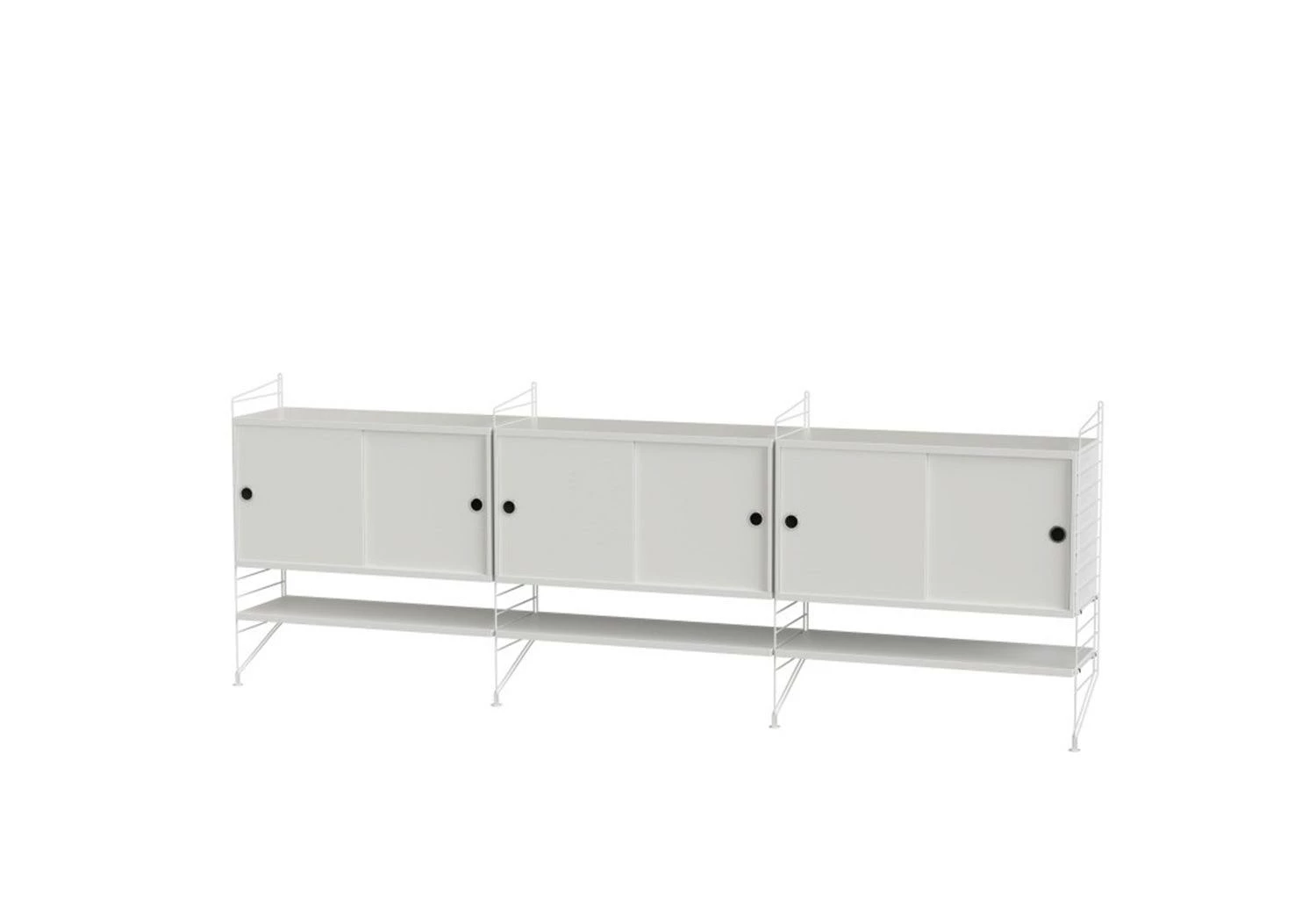 The String System is a robust and versatile shelving system offering different shelves depths, which can be combined and enriched with separate filing or display cabinets, magazine racks, table, drawers, desk, etc. modules.