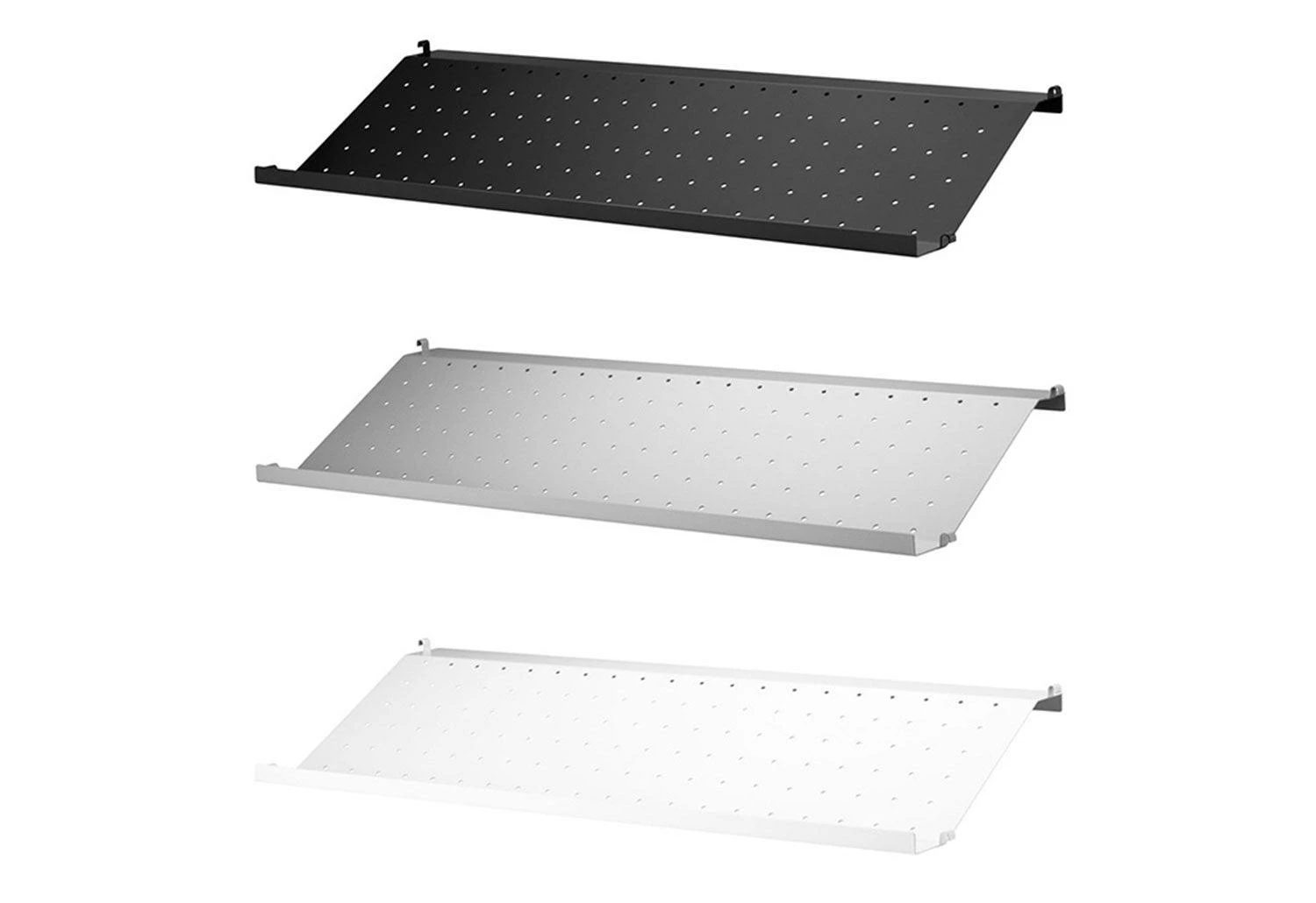 The shoe metal shelves are available in a black, grey or white finish and in two widths. They must be combined with 30cm deep wall panels.