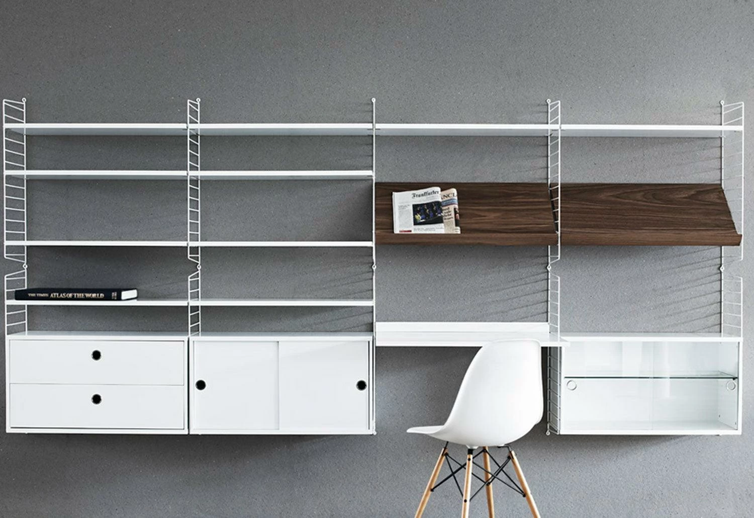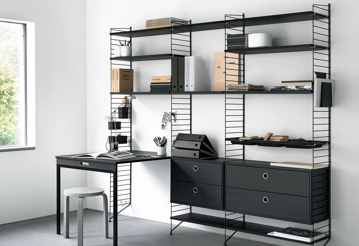 The String System is a robust and versatile shelving system offering different shelves depths, which can be combined and enriched with separate filing or display cabinets, magazine racks, table, drawers, desk, etc. modules.