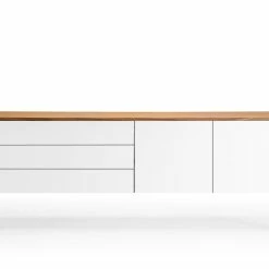 A wrap-around frame encloses the contrasting drawers and cabinets in a seemingly seamless wood exterior. The simple contrast between the wooden exterior frame and gloss for the recessed doors and drawers lends this piece an air of timeless modernity.