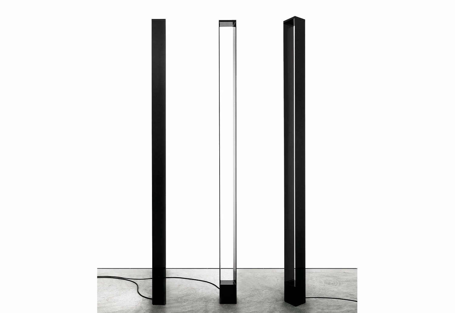 Conceived by the Italian designer Roberto Paoli, Tru is a family of floor and suspension lamps made from extruded aluminium. The floor design features two vertical panels that conceal the two light sources; one which emits an upward diffused light and another at the side which produces an indirect ambient light.