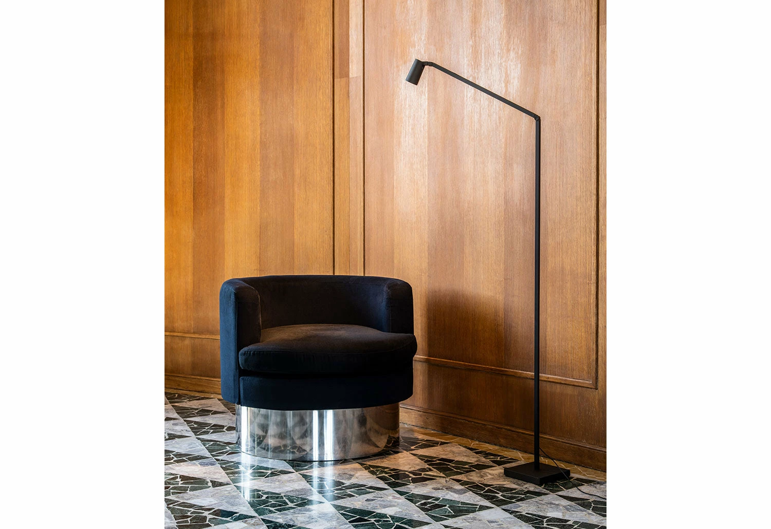 This lamp is suited to be placed by a sofa or armchair as a reading light. The structure of the lamp is created from extruded aluminium with joints for flexible positioning of the light and a dimmer on the stem of the lamp.