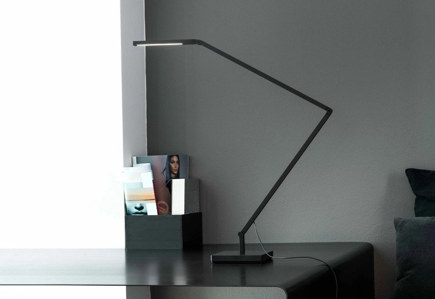 The Untitled table light is constructed from matt black painted aluminium with joints for flexible and directional positioning of the light. The light is available with a choice of two shades, linear and spot and either a table base or clamp base. Each shade allows for different light diffusion to suit any aesthetic. The light is fully rotatable.